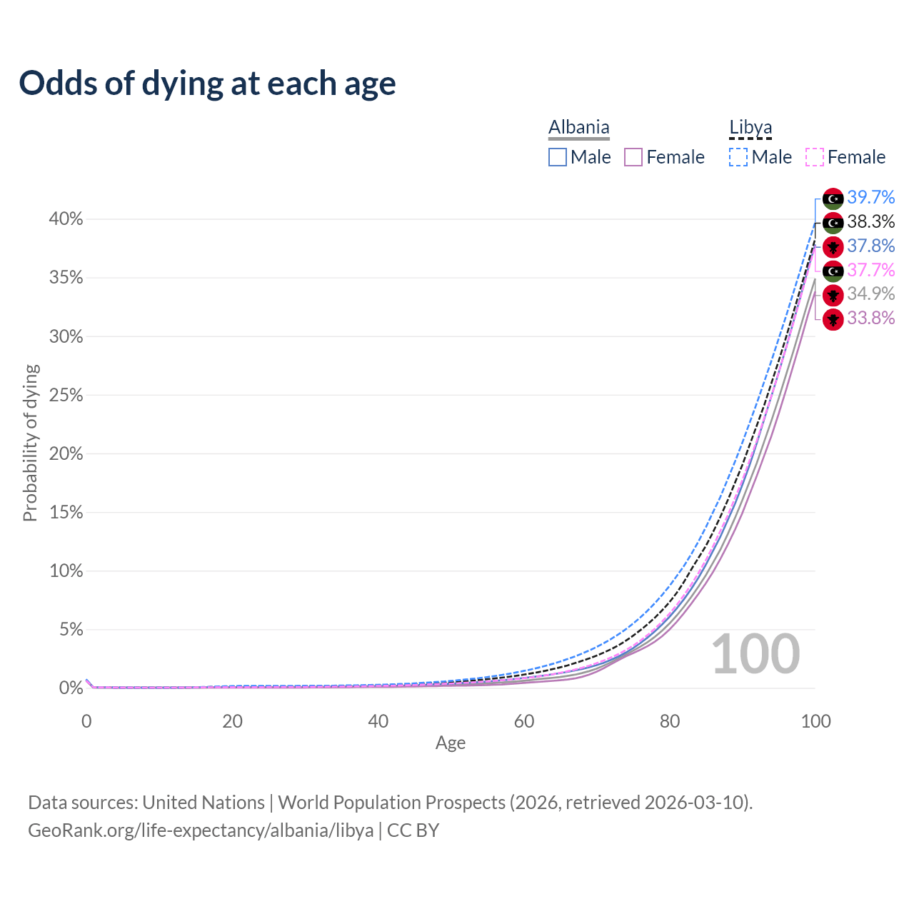 This life expectancy calculator shows the odds of living to 100, 95, 90, and below based on current age for both males and females in Albania and Libya, along with mean and median age of death. The calculations are based on the 2026 life tables (actuarial tables) from the UN World Population Prospects.