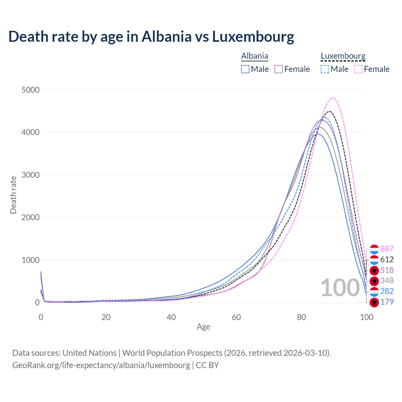 This life expectancy calculator shows the odds of living to 100, 95, 90, and below based on current age for both males and females in Albania and Luxembourg, along with mean and median age of death. The calculations are based on the 2026 life tables (actuarial tables) from the UN World Population Prospects.