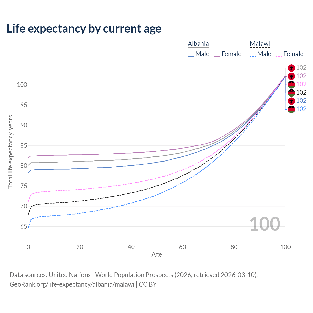 This life expectancy calculator shows the odds of living to 100, 95, 90, and below based on current age for both males and females in Albania and Malawi, along with mean and median age of death. The calculations are based on the 2026 life tables (actuarial tables) from the UN World Population Prospects.