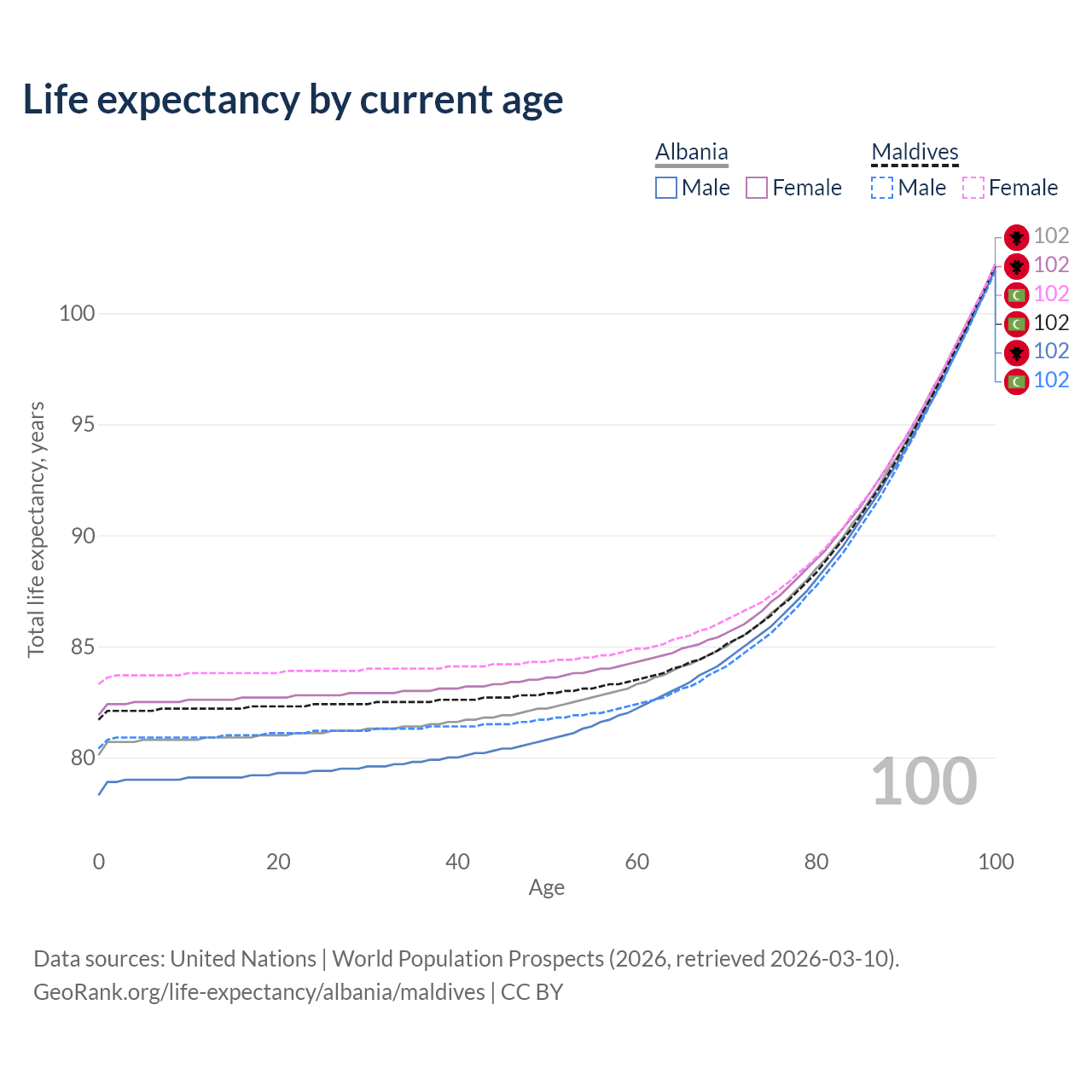 This life expectancy calculator shows the odds of living to 100, 95, 90, and below based on current age for both males and females in Albania and Maldives, along with mean and median age of death. The calculations are based on the 2026 life tables (actuarial tables) from the UN World Population Prospects.
