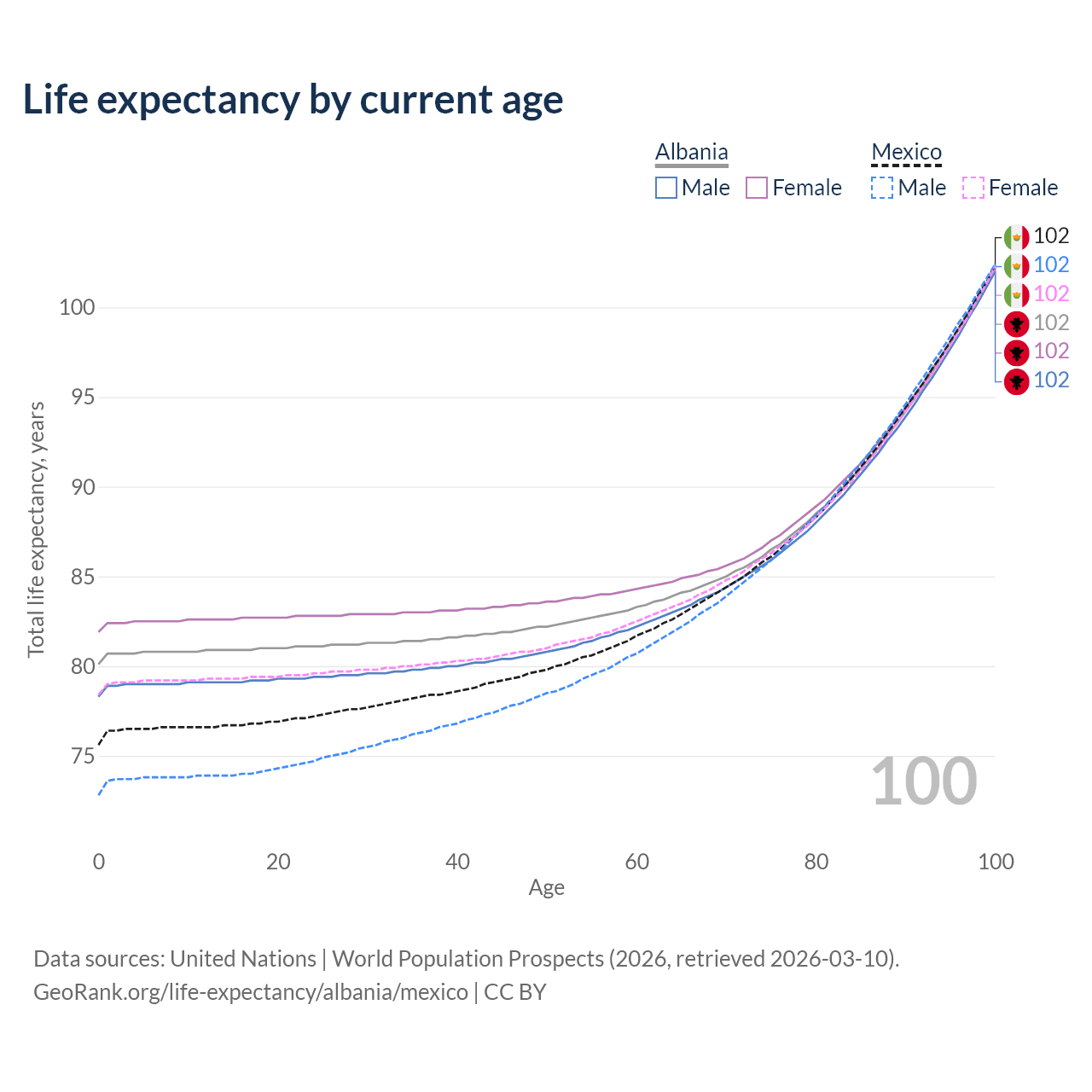 This life expectancy calculator shows the odds of living to 100, 95, 90, and below based on current age for both males and females in Albania and Mexico, along with mean and median age of death. The calculations are based on the 2026 life tables (actuarial tables) from the UN World Population Prospects.