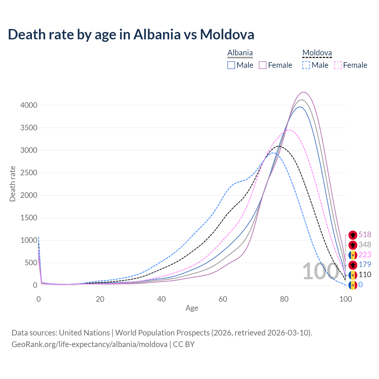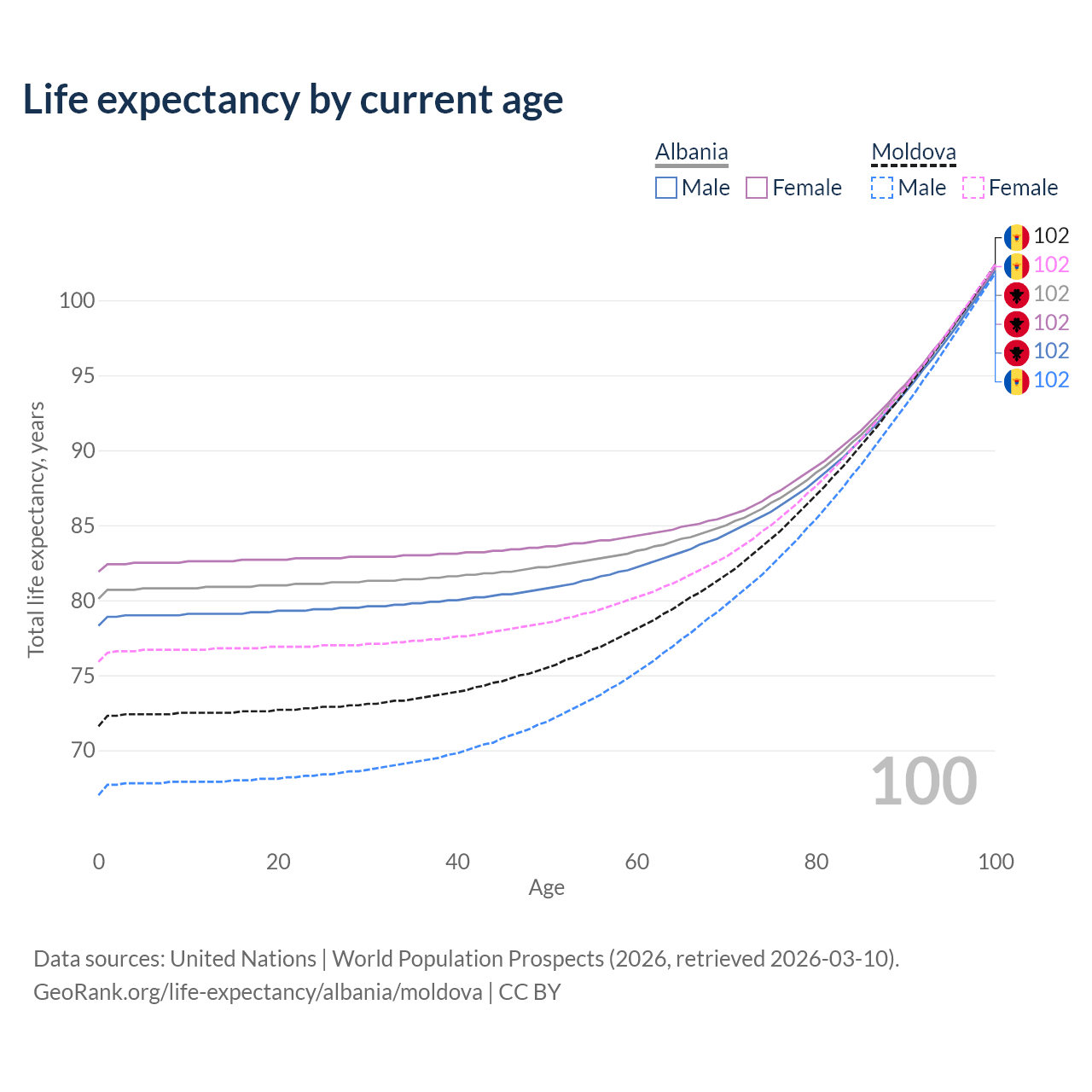 This life expectancy calculator shows the odds of living to 100, 95, 90, and below based on current age for both males and females in Albania and Moldova, along with mean and median age of death. The calculations are based on the 2026 life tables (actuarial tables) from the UN World Population Prospects.
