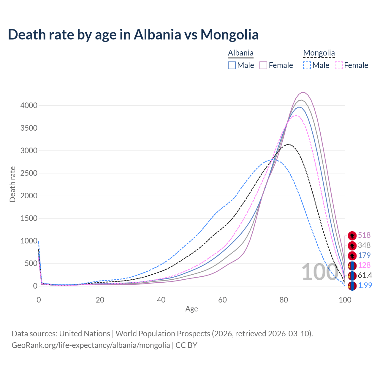 In Albania, the most common age of death is 86, compared to 82 in Mongolia. The median age of death is 83.2 in Albania and 76 in Mongolia, meaning only half of each cohort is expected to live past that age.