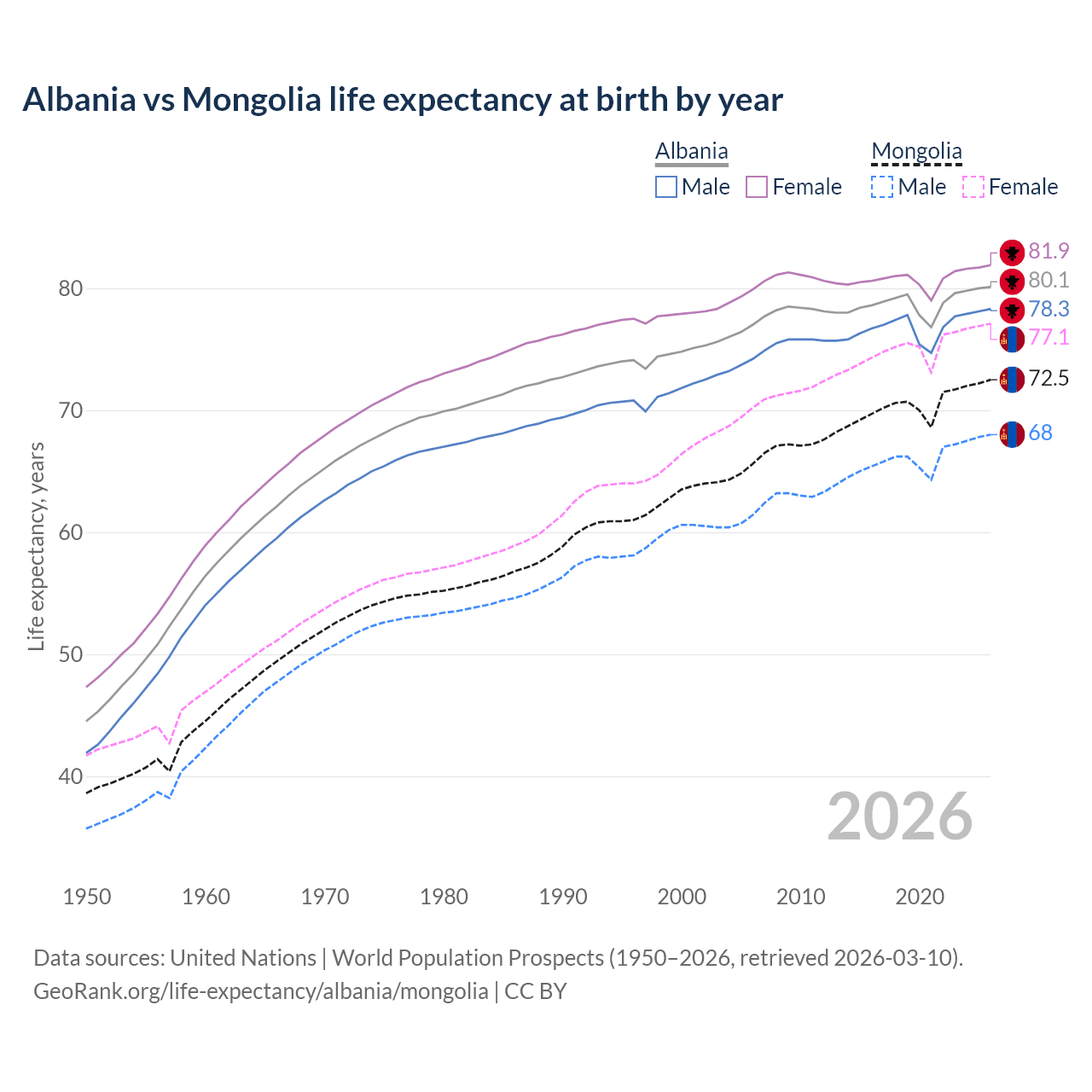 The average life expectancy at birth is 80.1 years in Albania vs 72.5 in Mongolia. Albania is ranked 46/197 by life expectancy, and Mongolia is 120/197. In Albania, the life expectancy is 78.3 years for males and 81.9 years for females. In Mongolia, it's 68 years for males and 77.1 years for females.
