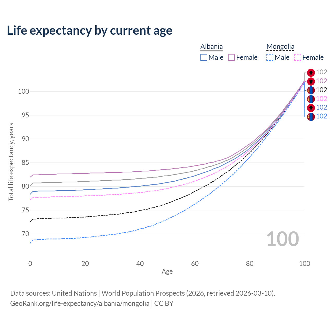 This life expectancy calculator shows the odds of living to 100, 95, 90, and below based on current age for both males and females in Albania and Mongolia, along with mean and median age of death. The calculations are based on the 2026 life tables (actuarial tables) from the UN World Population Prospects.