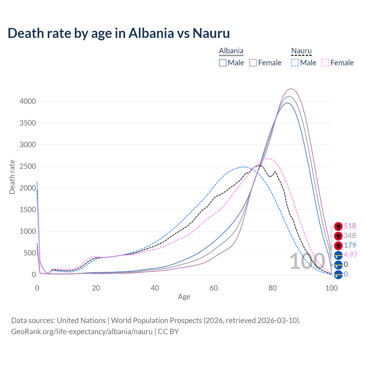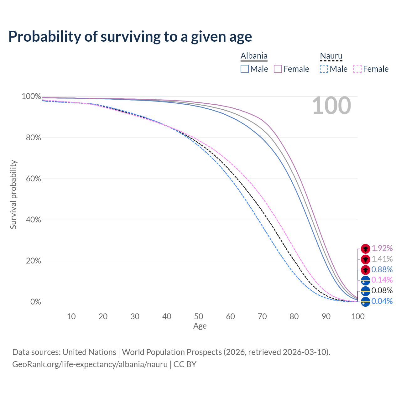 This life expectancy calculator shows the odds of living to 100, 95, 90, and below based on current age for both males and females in Albania and Nauru, along with mean and median age of death. The calculations are based on the 2026 life tables (actuarial tables) from the UN World Population Prospects.