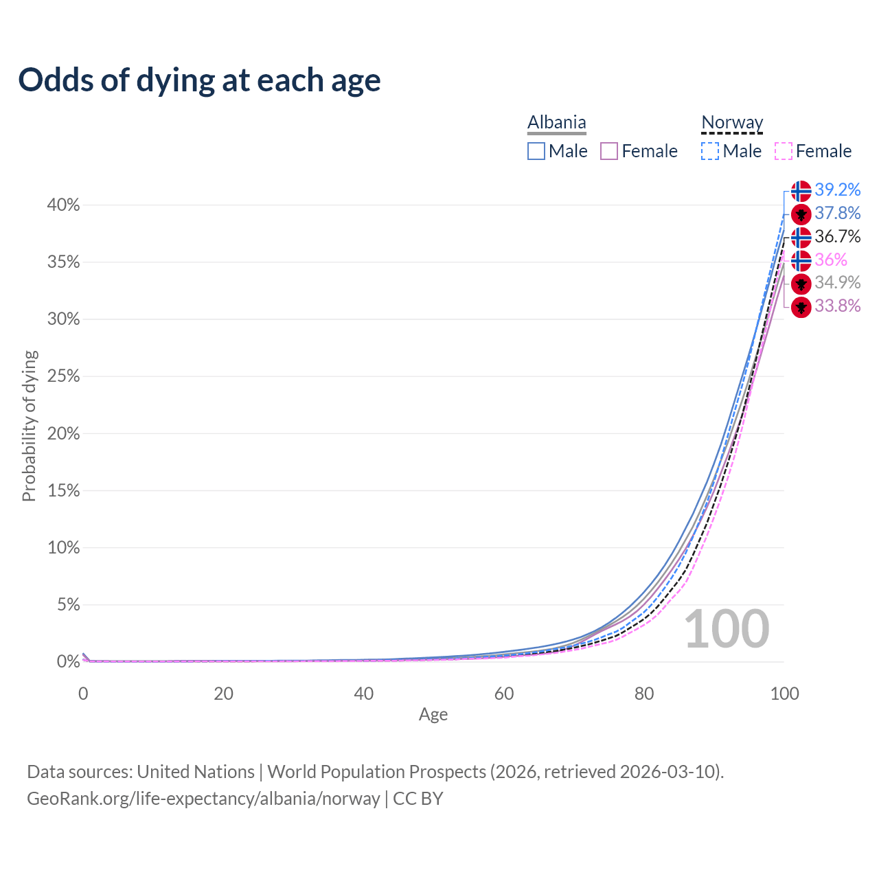This life expectancy calculator shows the odds of living to 100, 95, 90, and below based on current age for both males and females in Albania and Norway, along with mean and median age of death. The calculations are based on the 2026 life tables (actuarial tables) from the UN World Population Prospects.