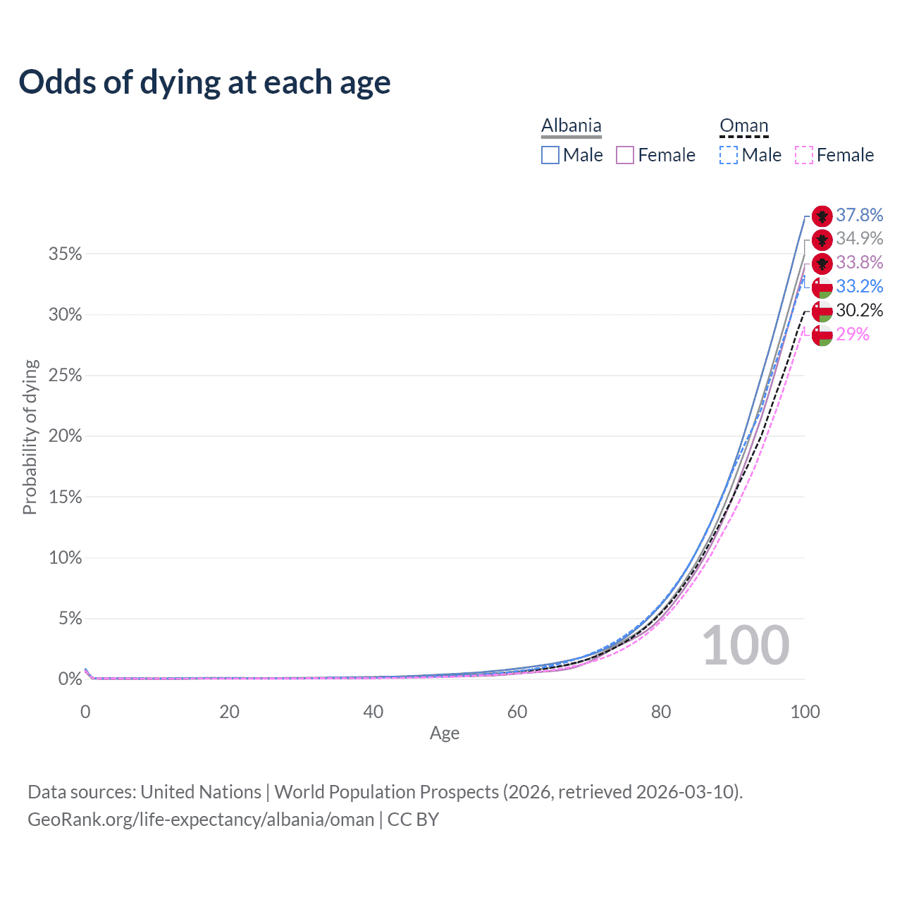 This life expectancy calculator shows the odds of living to 100, 95, 90, and below based on current age for both males and females in Albania and Oman, along with mean and median age of death. The calculations are based on the 2026 life tables (actuarial tables) from the UN World Population Prospects.