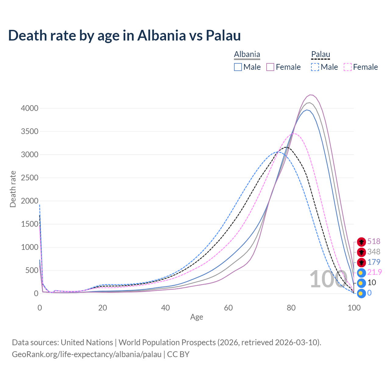 This life expectancy calculator shows the odds of living to 100, 95, 90, and below based on current age for both males and females in Albania and Palau, along with mean and median age of death. The calculations are based on the 2026 life tables (actuarial tables) from the UN World Population Prospects.