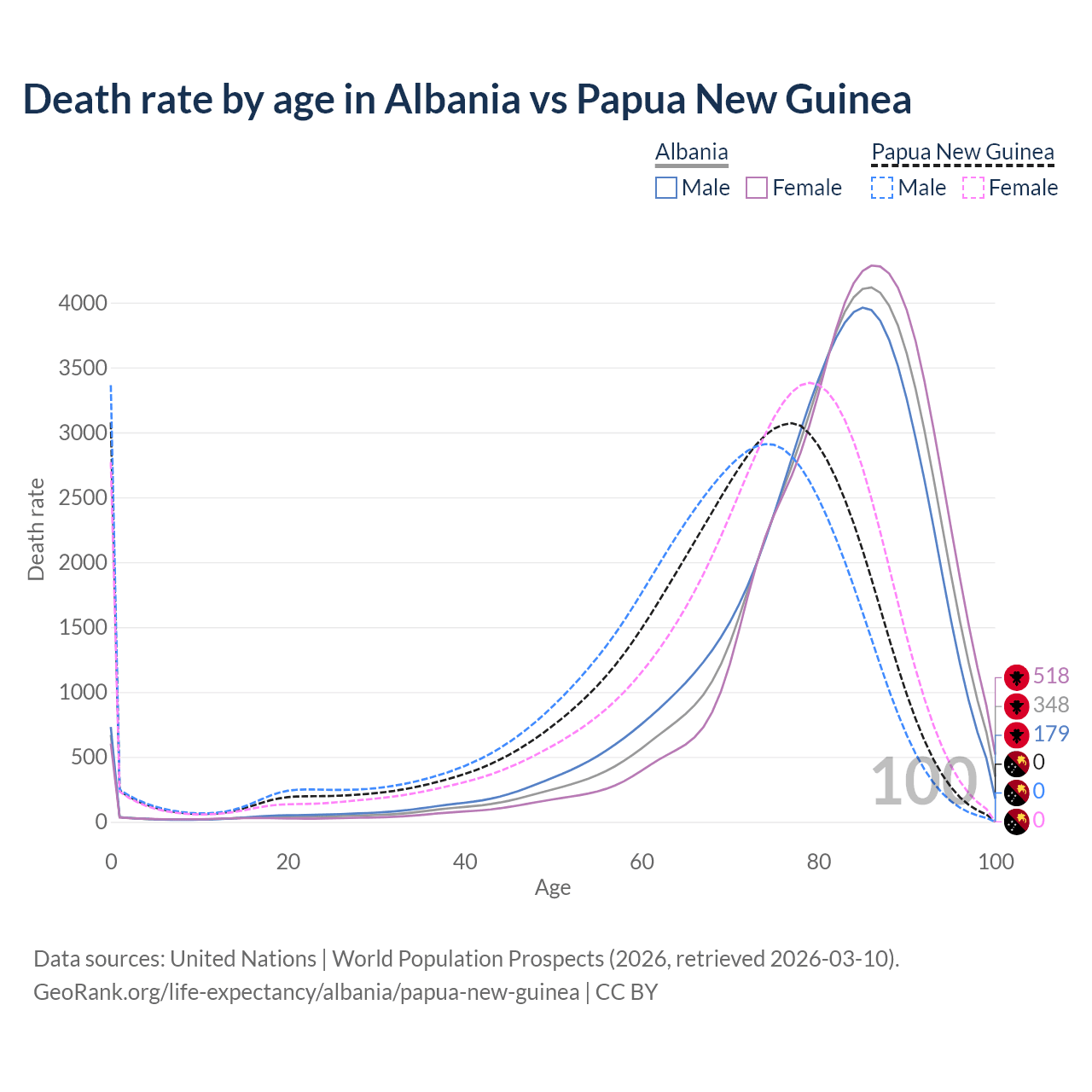 In Albania, the most common age of death is 86, compared to 0 in Papua New Guinea. The median age of death is 83.2 in Albania and 71.7 in Papua New Guinea, meaning only half of each cohort is expected to live past that age.