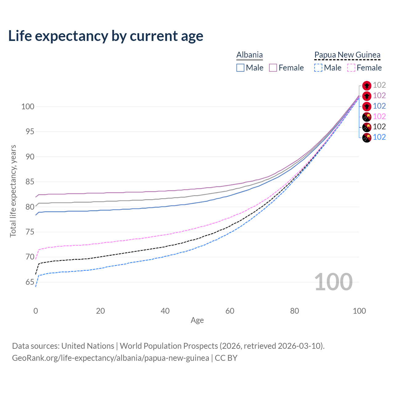 This life expectancy calculator shows the odds of living to 100, 95, 90, and below based on current age for both males and females in Albania and Papua New Guinea, along with mean and median age of death. The calculations are based on the 2026 life tables (actuarial tables) from the UN World Population Prospects.