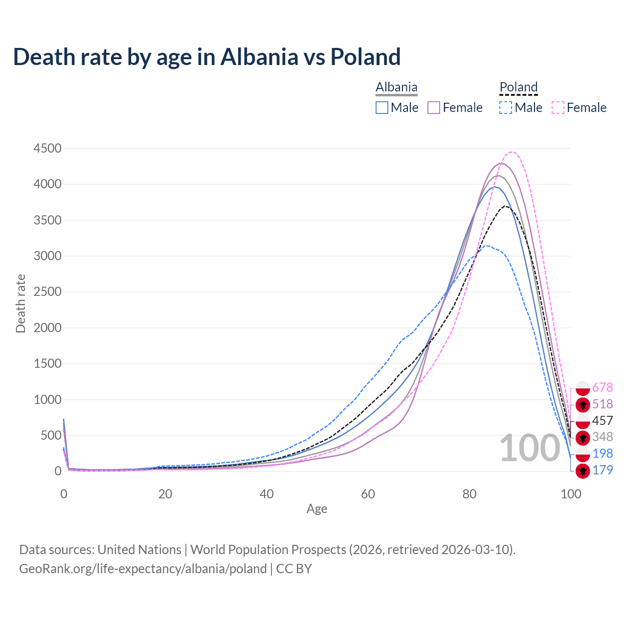 In Albania, the most common age of death is 86, compared to 87 in Poland. The median age of death is 83.2 in Albania and 82.5 in Poland, meaning only half of each cohort is expected to live past that age.