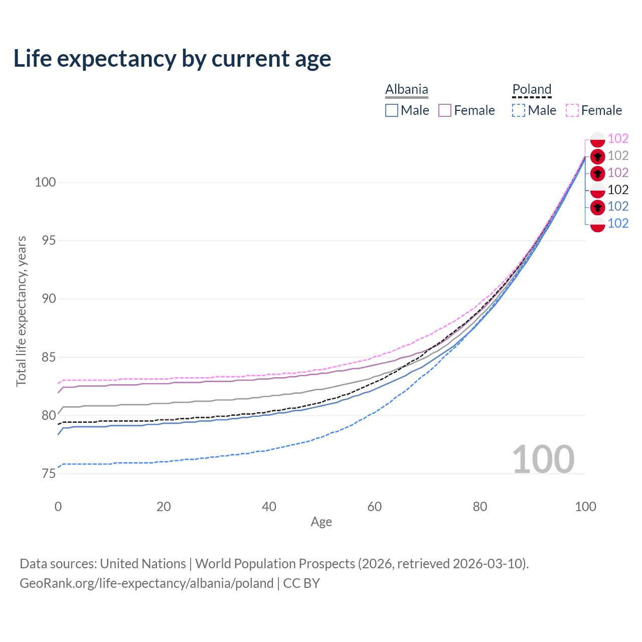 This life expectancy calculator shows the odds of living to 100, 95, 90, and below based on current age for both males and females in Albania and Poland, along with mean and median age of death. The calculations are based on the 2026 life tables (actuarial tables) from the UN World Population Prospects.