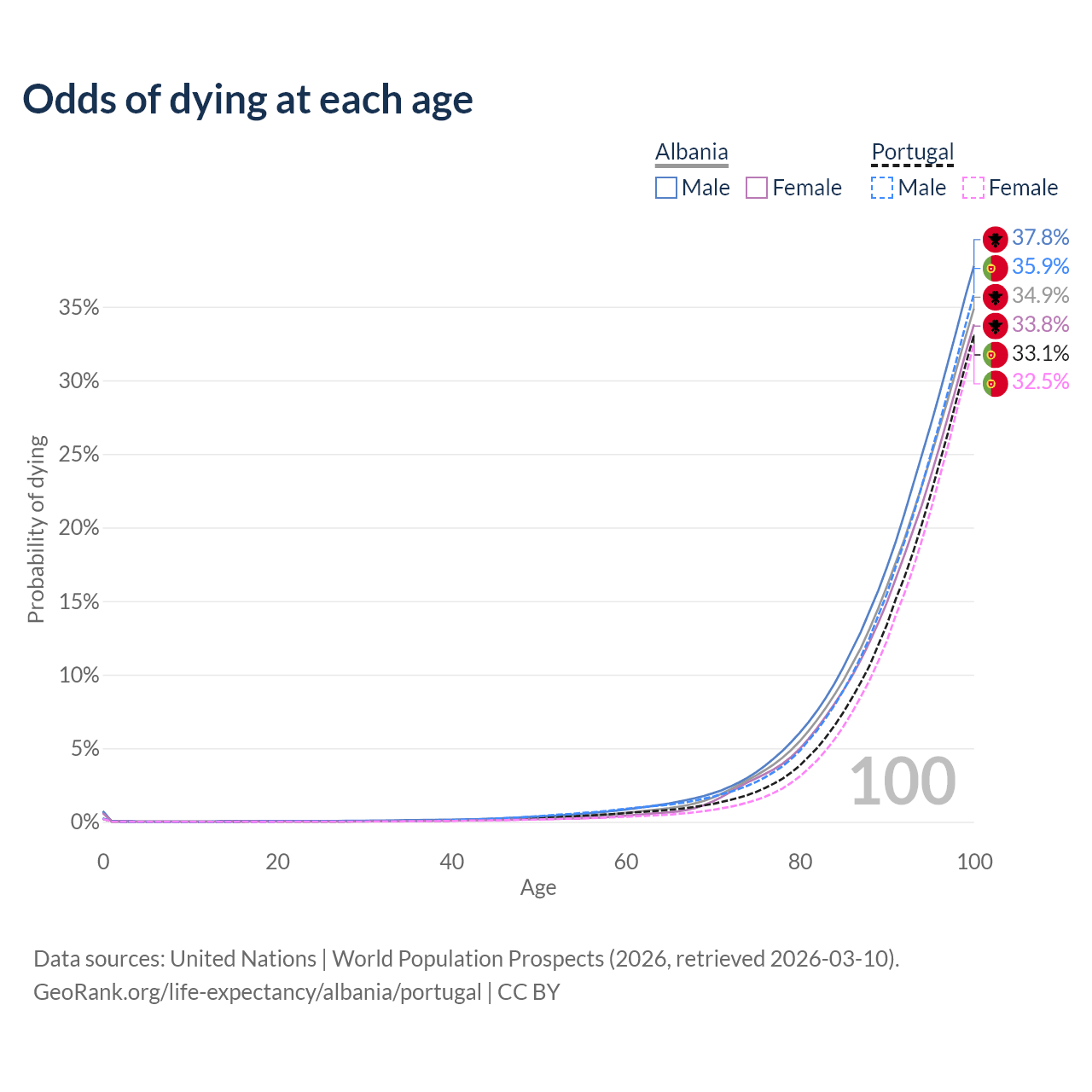 This life expectancy calculator shows the odds of living to 100, 95, 90, and below based on current age for both males and females in Albania and Portugal, along with mean and median age of death. The calculations are based on the 2026 life tables (actuarial tables) from the UN World Population Prospects.