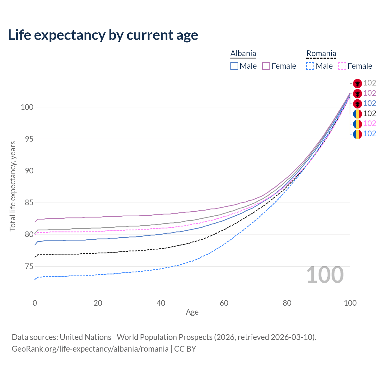 This life expectancy calculator shows the odds of living to 100, 95, 90, and below based on current age for both males and females in Albania and Romania, along with mean and median age of death. The calculations are based on the 2026 life tables (actuarial tables) from the UN World Population Prospects.