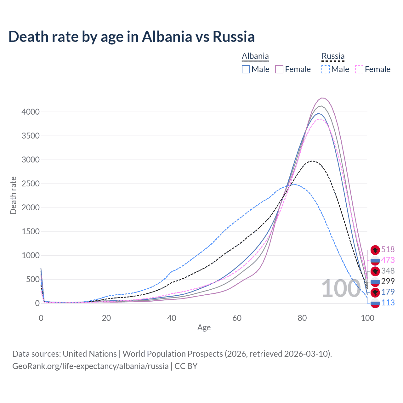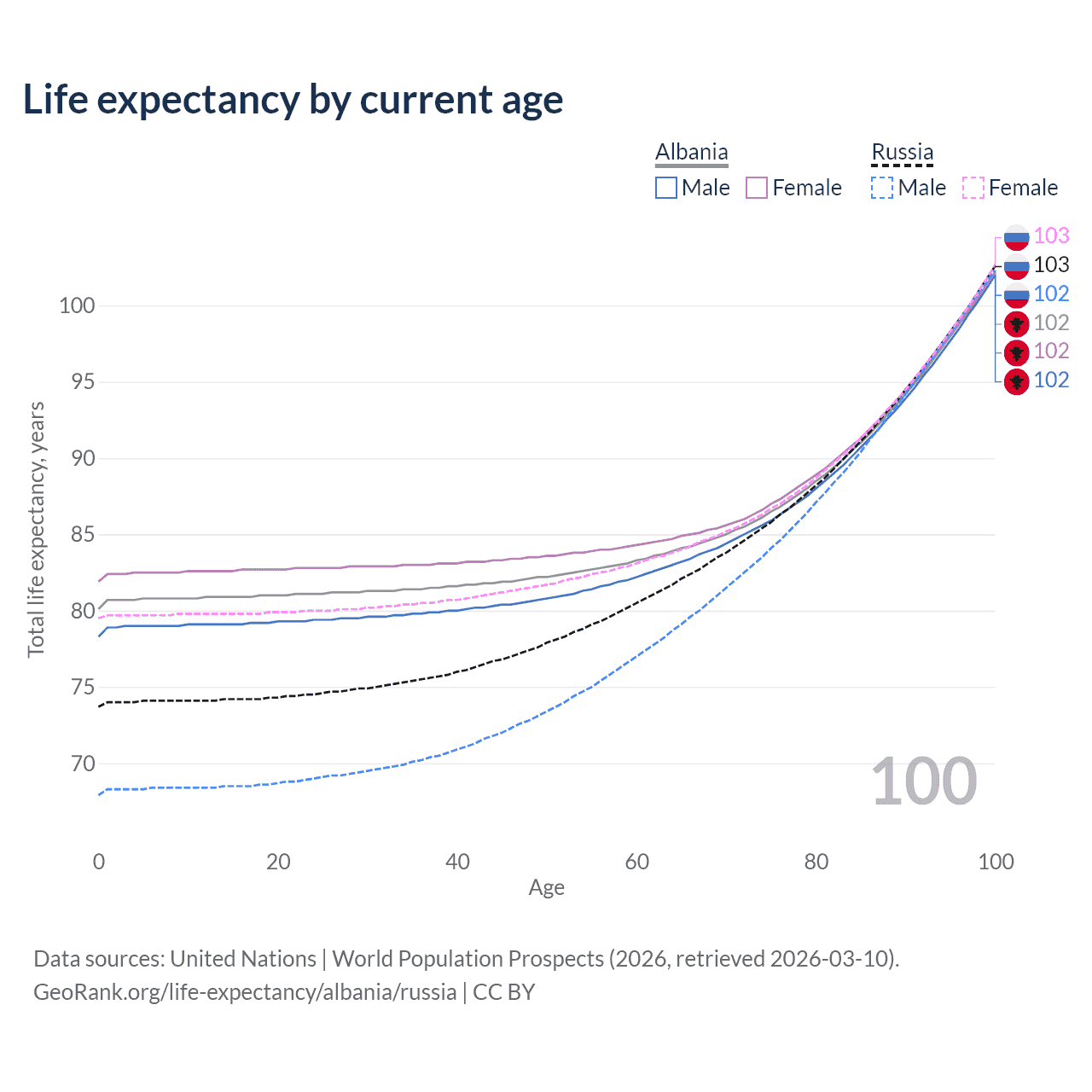 This life expectancy calculator shows the odds of living to 100, 95, 90, and below based on current age for both males and females in Albania and Russia, along with mean and median age of death. The calculations are based on the 2026 life tables (actuarial tables) from the UN World Population Prospects.
