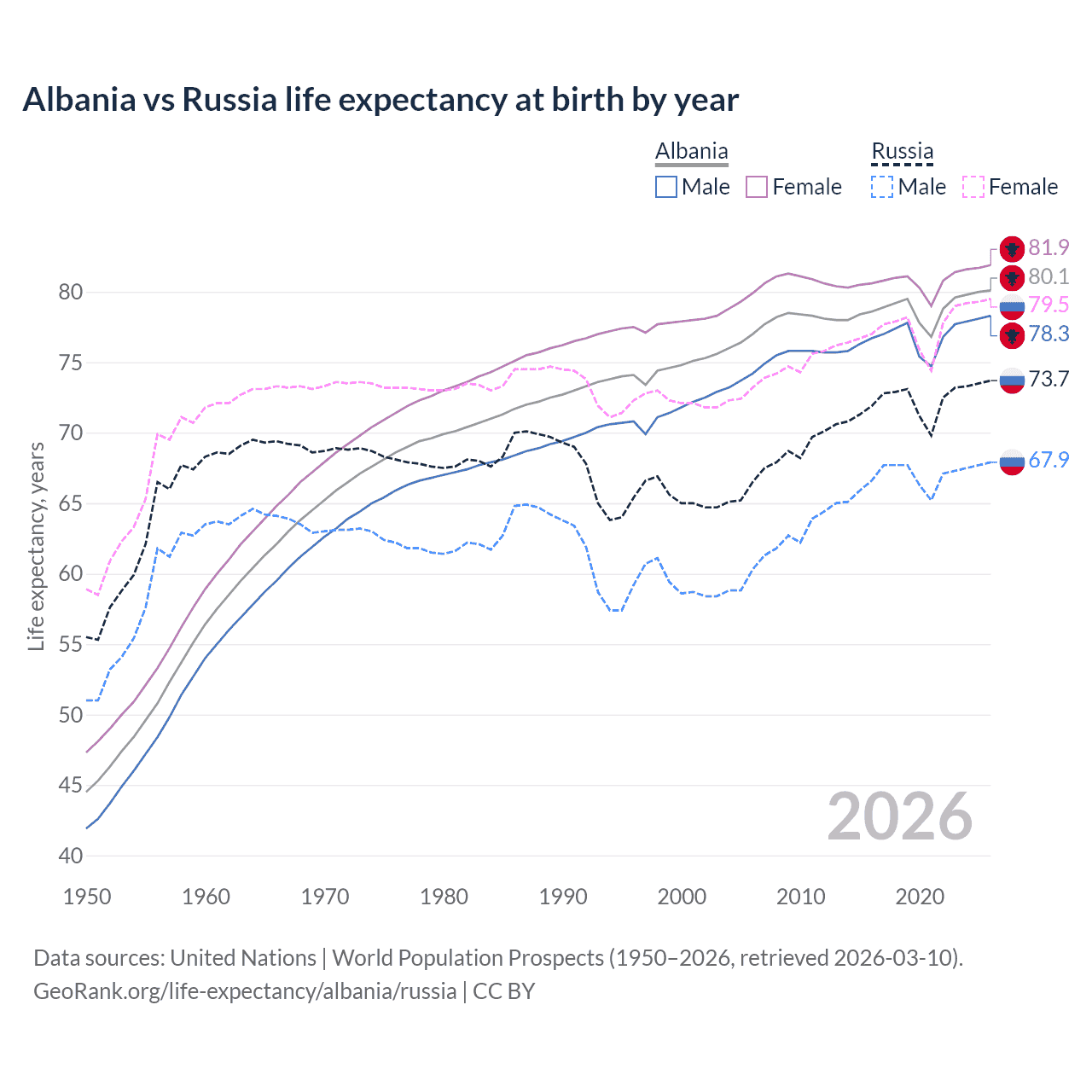 The average life expectancy at birth is 80.1 years in Albania vs 73.7 in Russia. Albania is ranked 46/197 by life expectancy, and Russia is 107/197. In Albania, the life expectancy is 78.3 years for males and 81.9 years for females. In Russia, it's 67.9 years for males and 79.5 years for females.