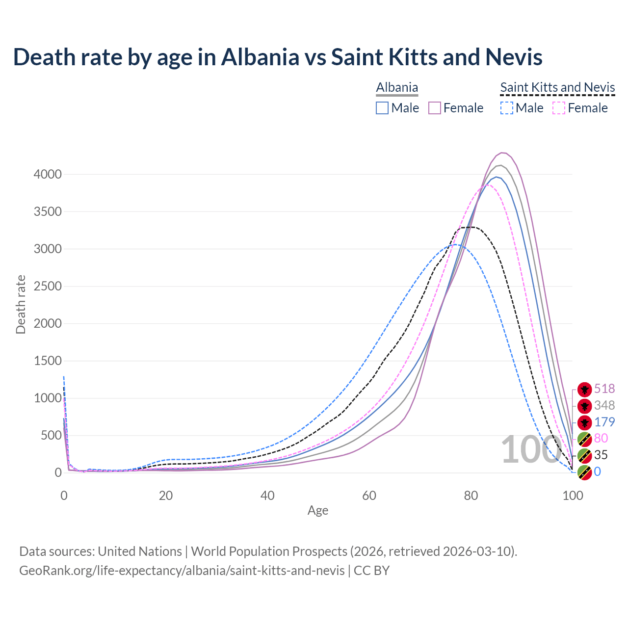 In Albania, the most common age of death is 86, compared to 80 in Saint Kitts and Nevis. The median age of death is 83.2 in Albania and 76.3 in Saint Kitts and Nevis, meaning only half of each cohort is expected to live past that age.