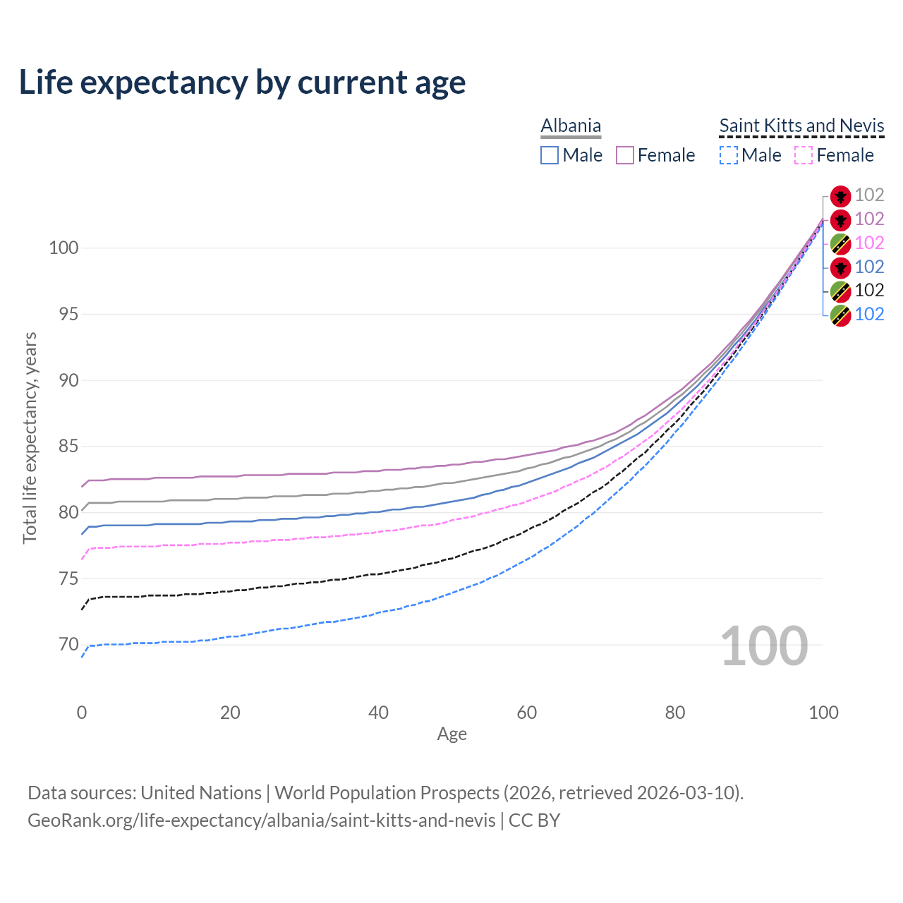 This life expectancy calculator shows the odds of living to 100, 95, 90, and below based on current age for both males and females in Albania and Saint Kitts and Nevis, along with mean and median age of death. The calculations are based on the 2026 life tables (actuarial tables) from the UN World Population Prospects.