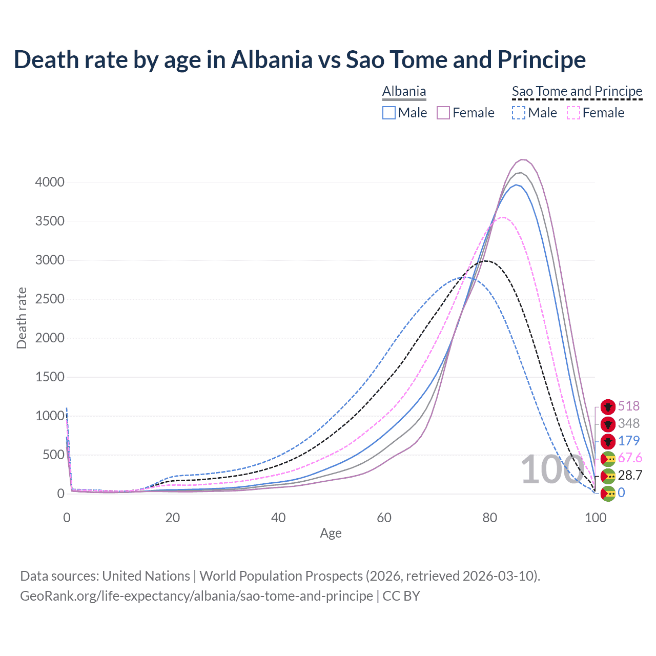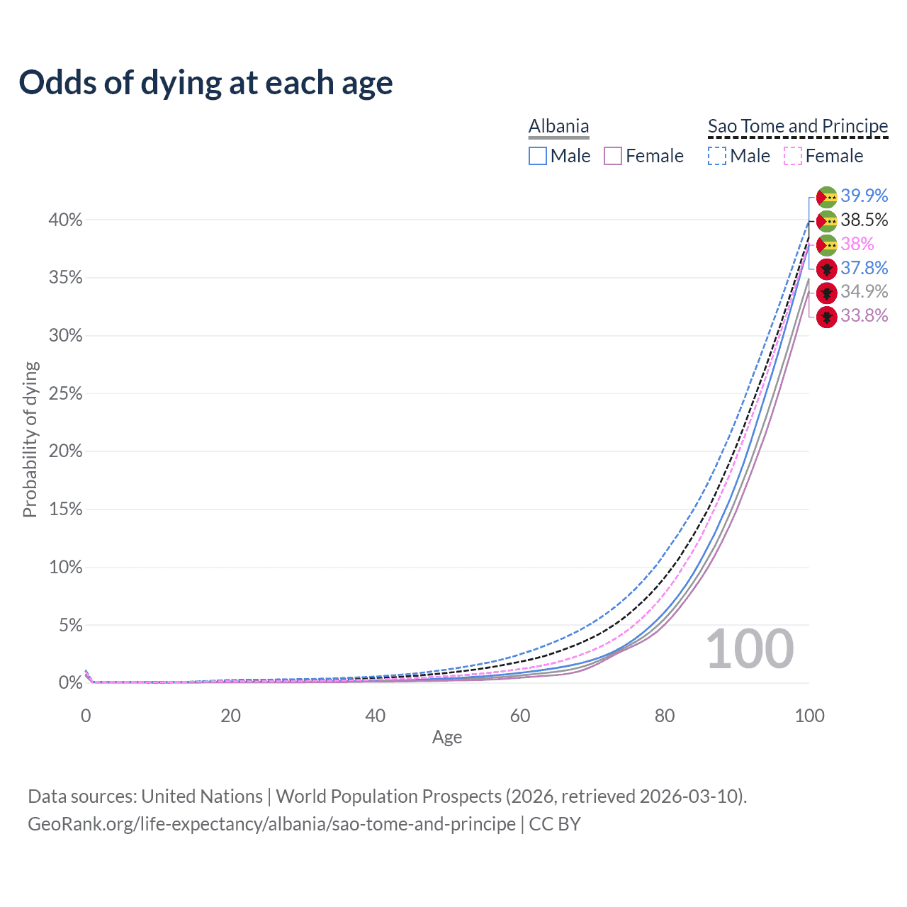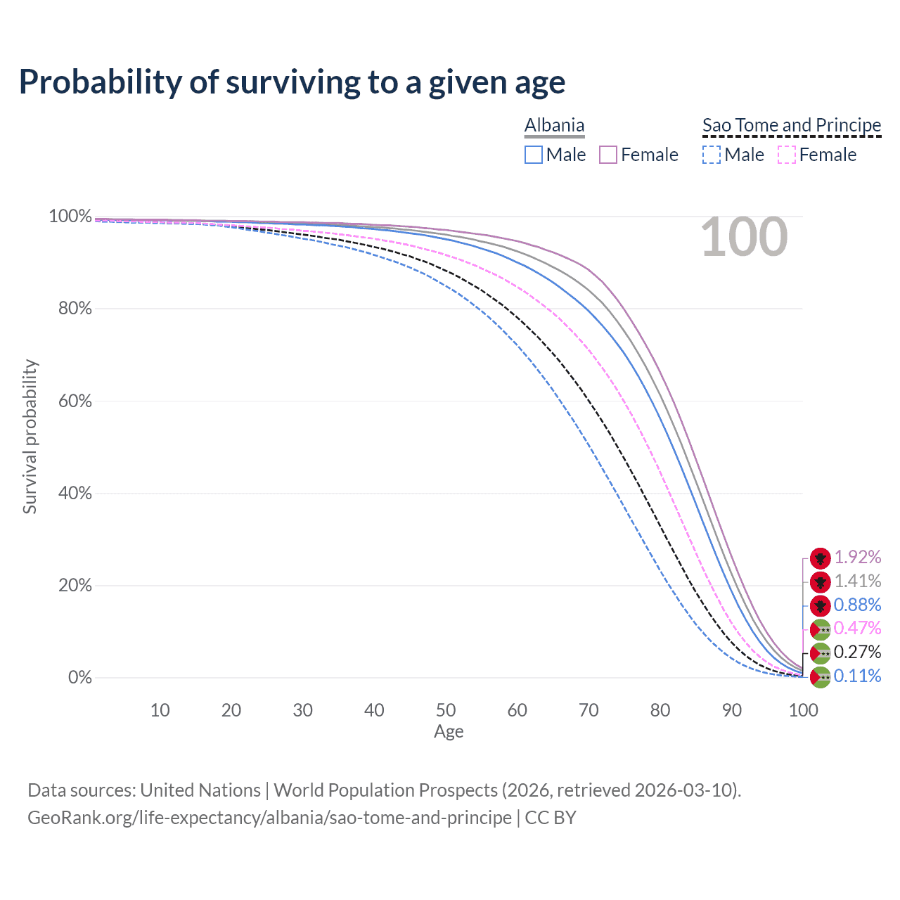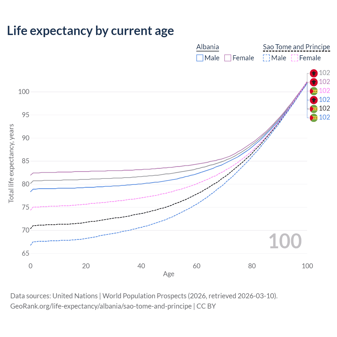 This life expectancy calculator shows the odds of living to 100, 95, 90, and below based on current age for both males and females in Albania and Sao Tome and Principe, along with mean and median age of death. The calculations are based on the 2026 life tables (actuarial tables) from the UN World Population Prospects.