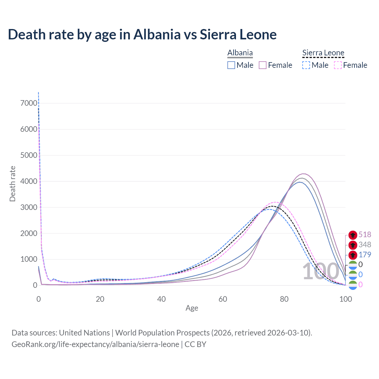 In Albania, the most common age of death is 86, compared to 0 in Sierra Leone. The median age of death is 83.2 in Albania and 70.8 in Sierra Leone, meaning only half of each cohort is expected to live past that age.