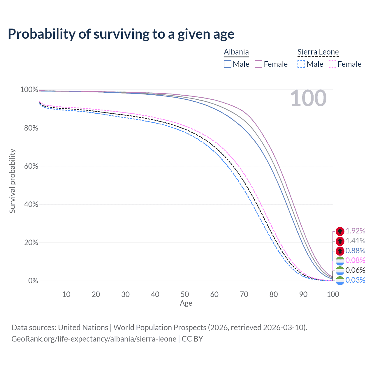 This life expectancy calculator shows the odds of living to 100, 95, 90, and below based on current age for both males and females in Albania and Sierra Leone, along with mean and median age of death. The calculations are based on the 2026 life tables (actuarial tables) from the UN World Population Prospects.