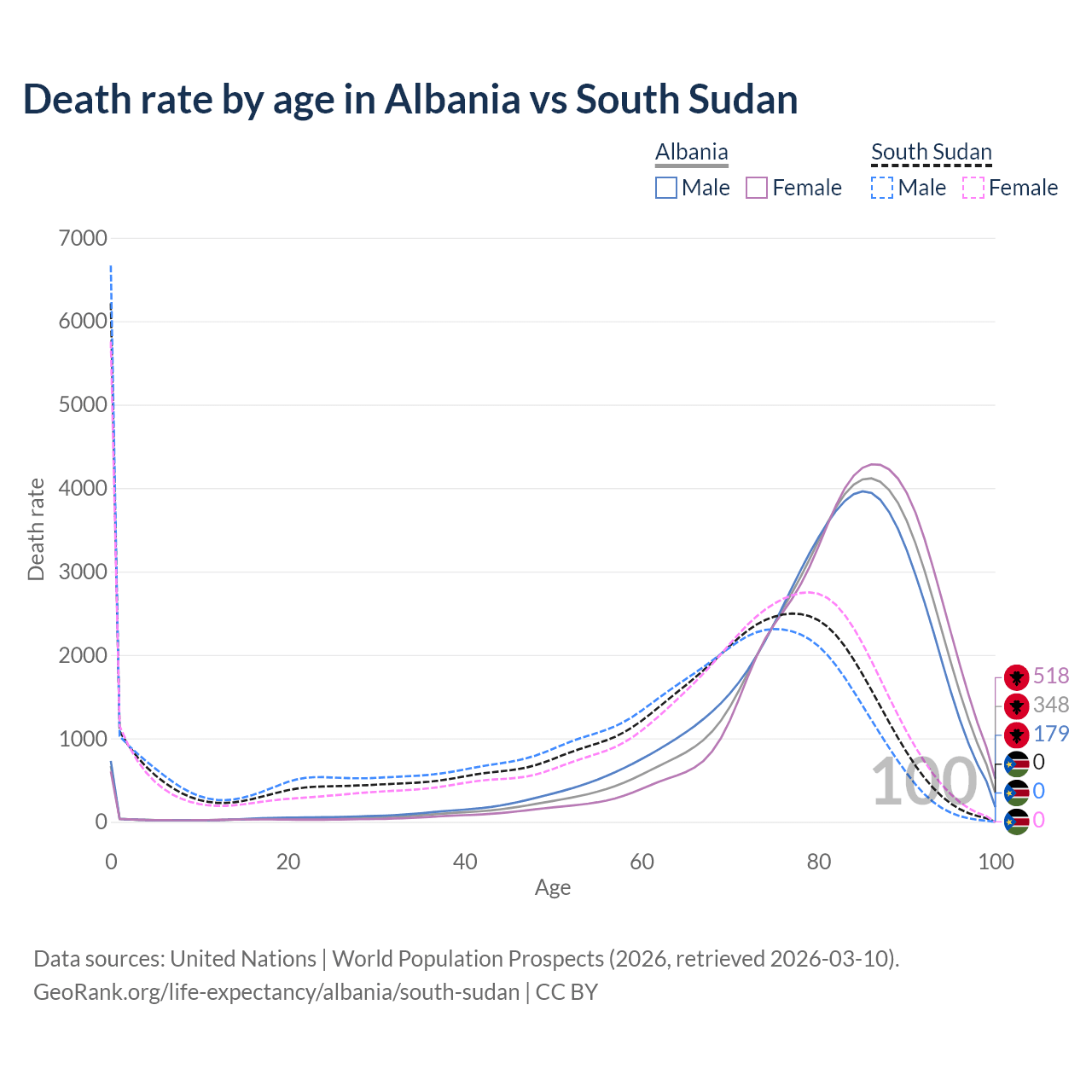 In Albania, the most common age of death is 86, compared to 0 in South Sudan. The median age of death is 83.2 in Albania and 67.5 in South Sudan, meaning only half of each cohort is expected to live past that age.
