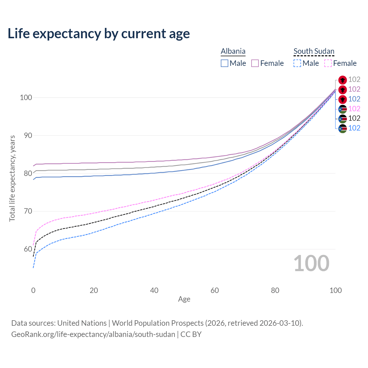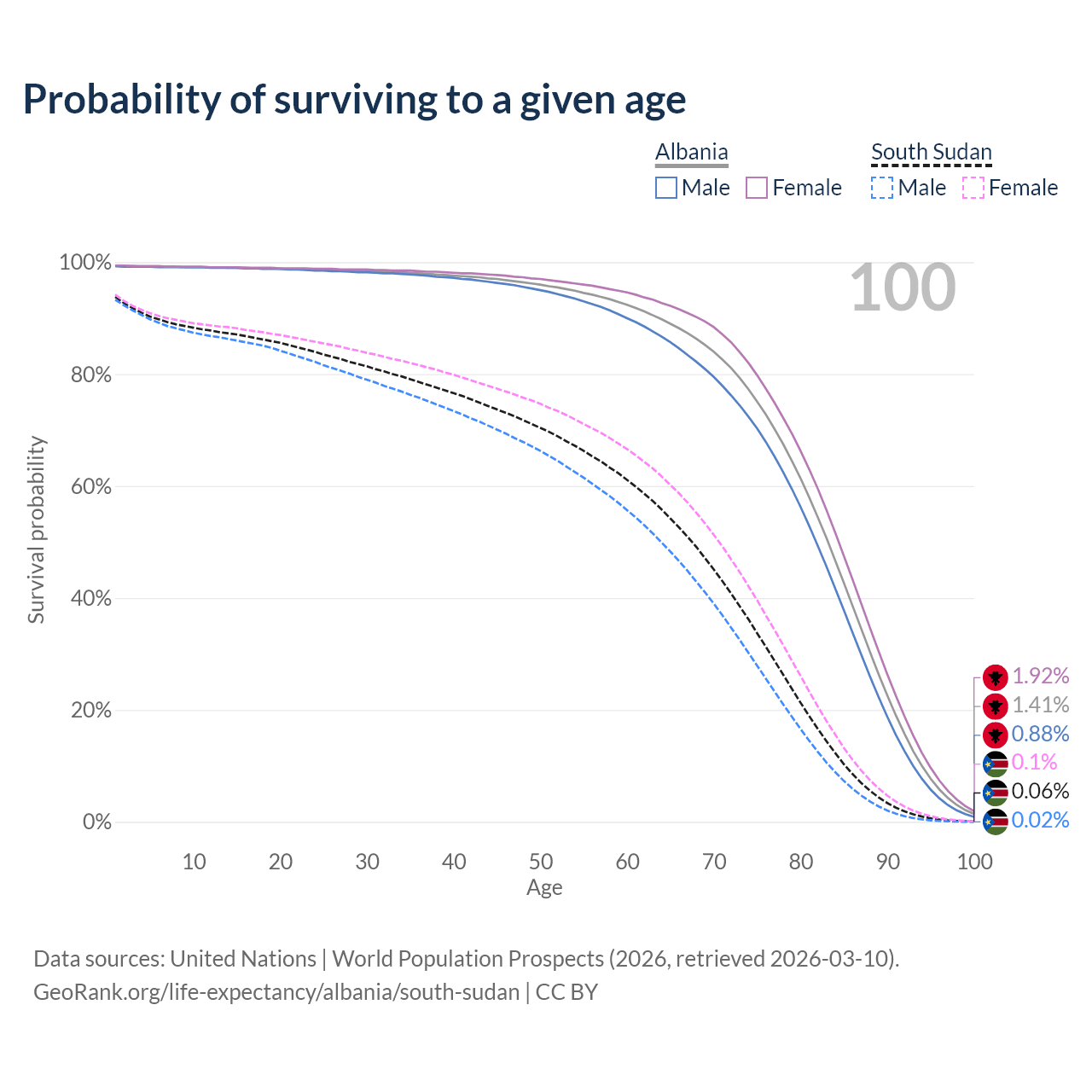 This life expectancy calculator shows the odds of living to 100, 95, 90, and below based on current age for both males and females in Albania and South Sudan, along with mean and median age of death. The calculations are based on the 2026 life tables (actuarial tables) from the UN World Population Prospects.