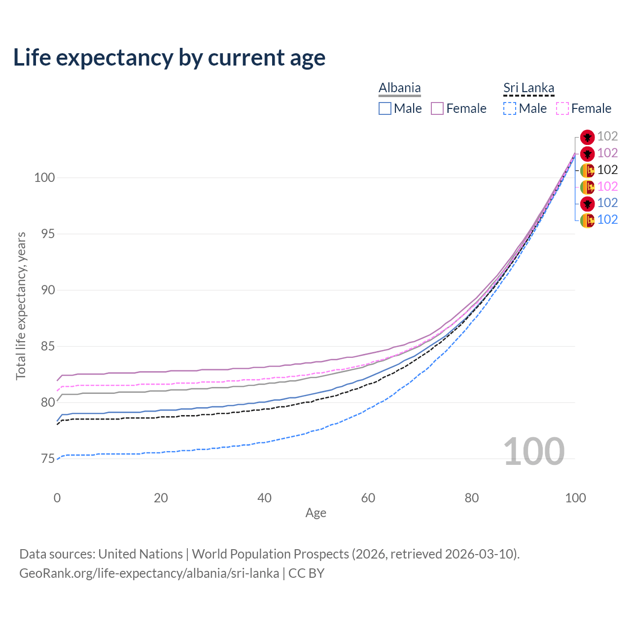 This life expectancy calculator shows the odds of living to 100, 95, 90, and below based on current age for both males and females in Albania and Sri Lanka, along with mean and median age of death. The calculations are based on the 2026 life tables (actuarial tables) from the UN World Population Prospects.