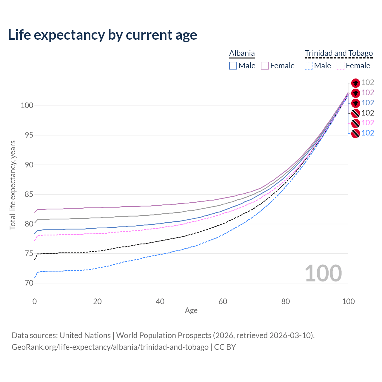This life expectancy calculator shows the odds of living to 100, 95, 90, and below based on current age for both males and females in Albania and Trinidad and Tobago, along with mean and median age of death. The calculations are based on the 2026 life tables (actuarial tables) from the UN World Population Prospects.