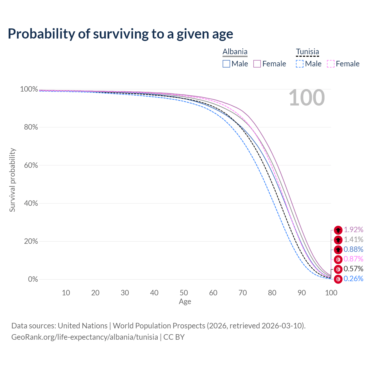 This life expectancy calculator shows the odds of living to 100, 95, 90, and below based on current age for both males and females in Albania and Tunisia, along with mean and median age of death. The calculations are based on the 2026 life tables (actuarial tables) from the UN World Population Prospects.