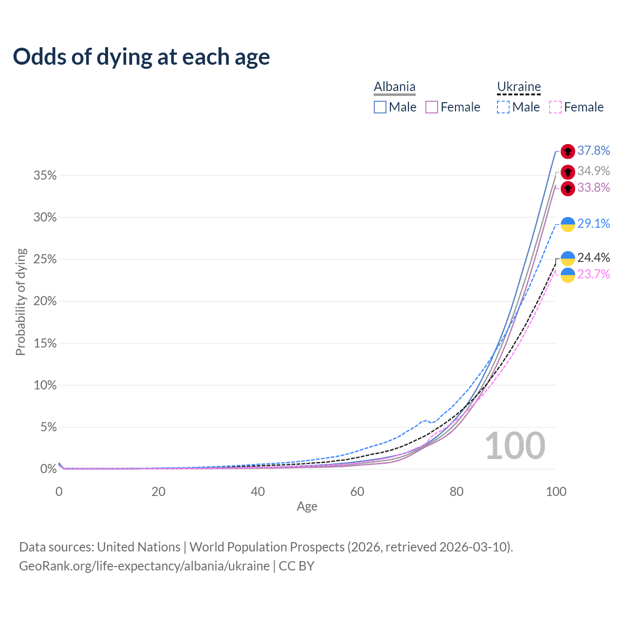 This life expectancy calculator shows the odds of living to 100, 95, 90, and below based on current age for both males and females in Albania and Ukraine, along with mean and median age of death. The calculations are based on the 2026 life tables (actuarial tables) from the UN World Population Prospects.