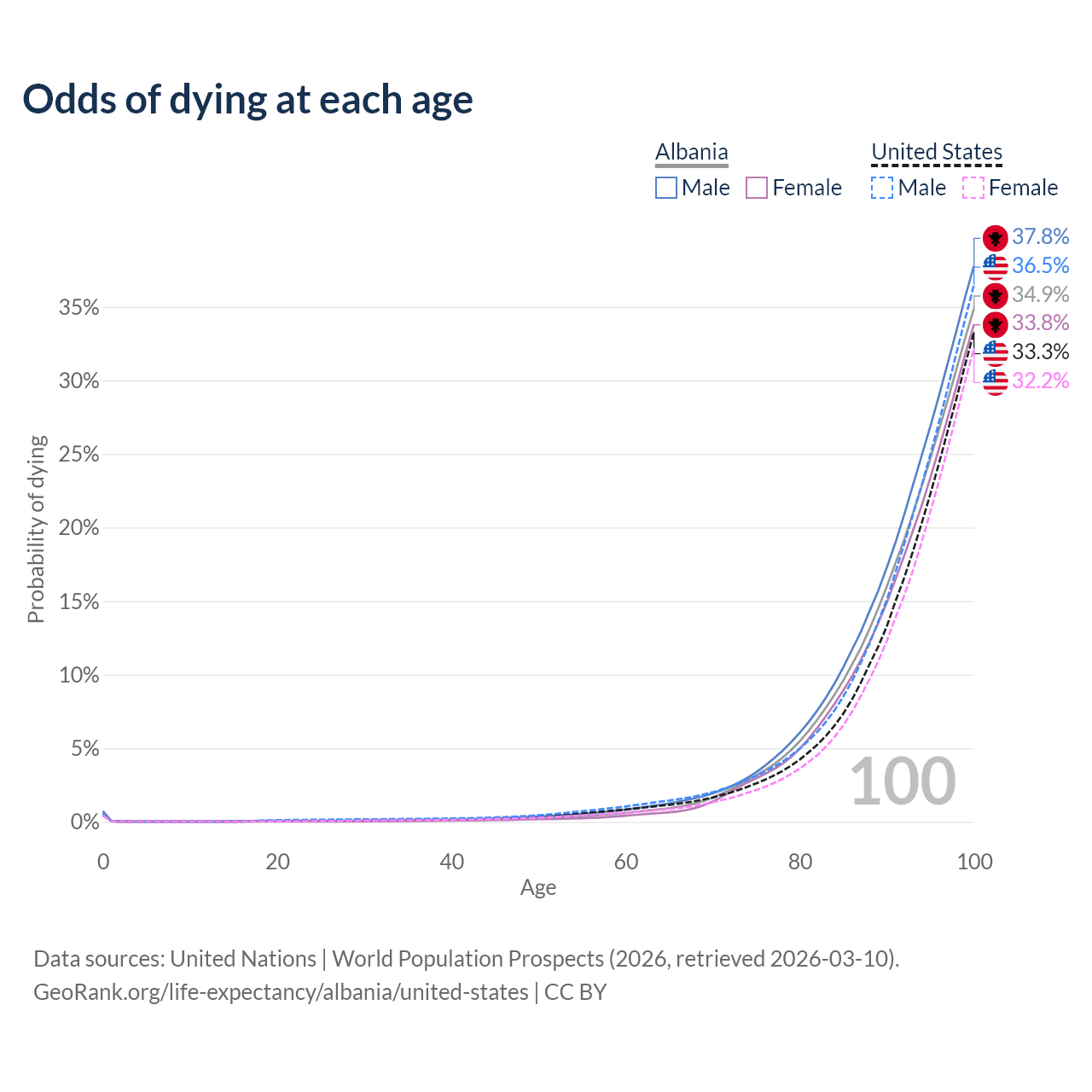 This life expectancy calculator shows the odds of living to 100, 95, 90, and below based on current age for both males and females in Albania and the United States, along with mean and median age of death. The calculations are based on the 2026 life tables (actuarial tables) from the UN World Population Prospects.