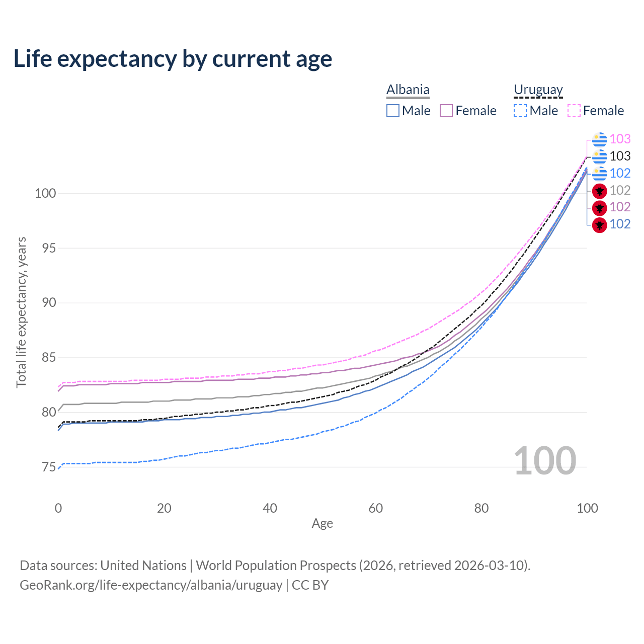 This life expectancy calculator shows the odds of living to 100, 95, 90, and below based on current age for both males and females in Albania and Uruguay, along with mean and median age of death. The calculations are based on the 2026 life tables (actuarial tables) from the UN World Population Prospects.