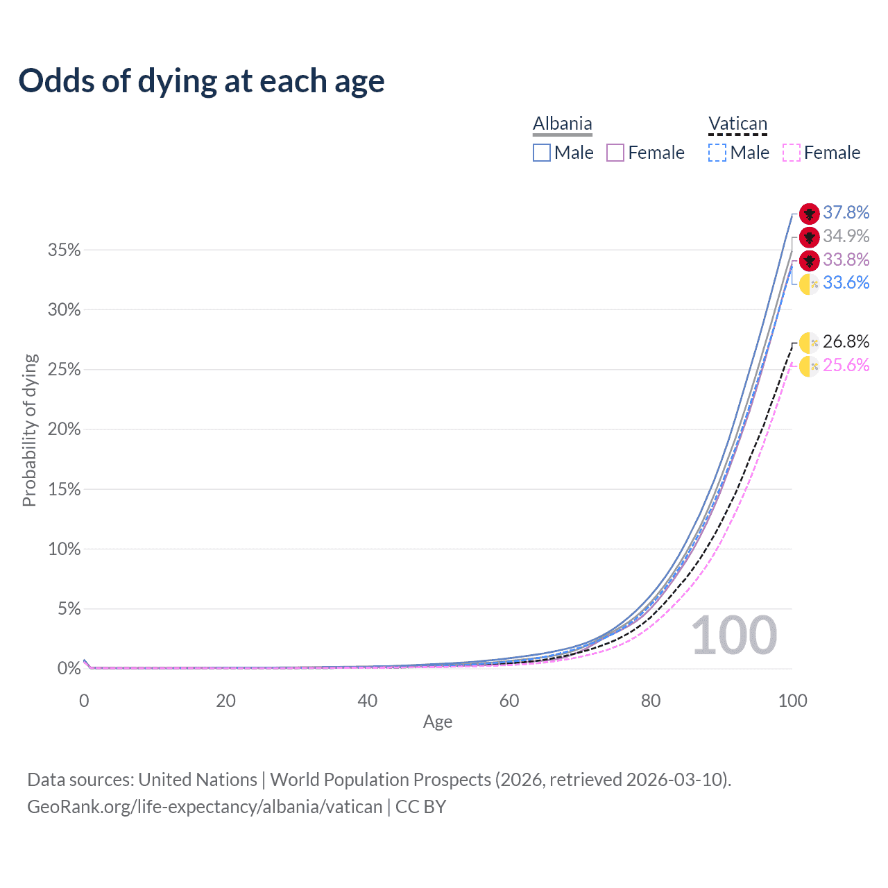 This life expectancy calculator shows the odds of living to 100, 95, 90, and below based on current age for both males and females in Albania and the Vatican, along with mean and median age of death. The calculations are based on the 2026 life tables (actuarial tables) from the UN World Population Prospects.