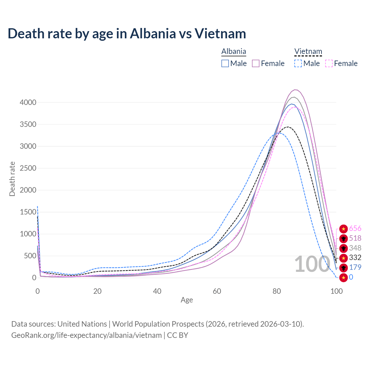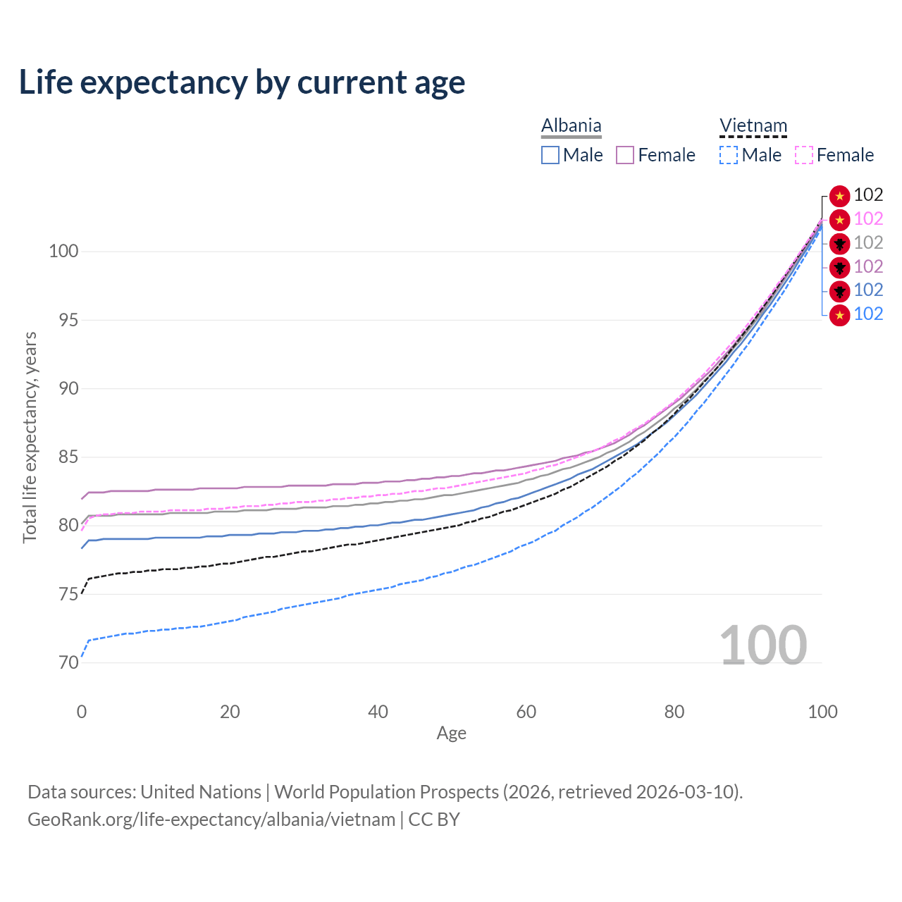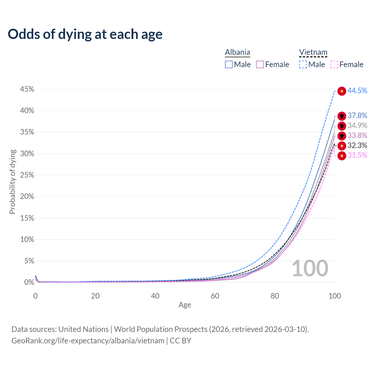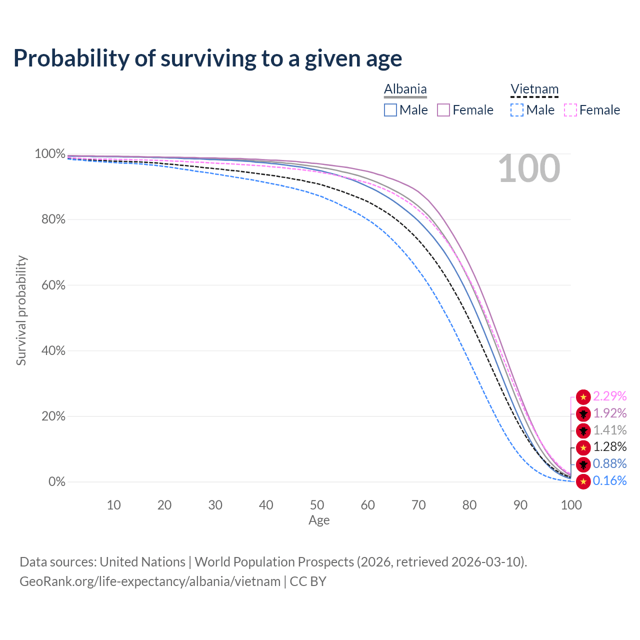 This life expectancy calculator shows the odds of living to 100, 95, 90, and below based on current age for both males and females in Albania and Vietnam, along with mean and median age of death. The calculations are based on the 2026 life tables (actuarial tables) from the UN World Population Prospects.
