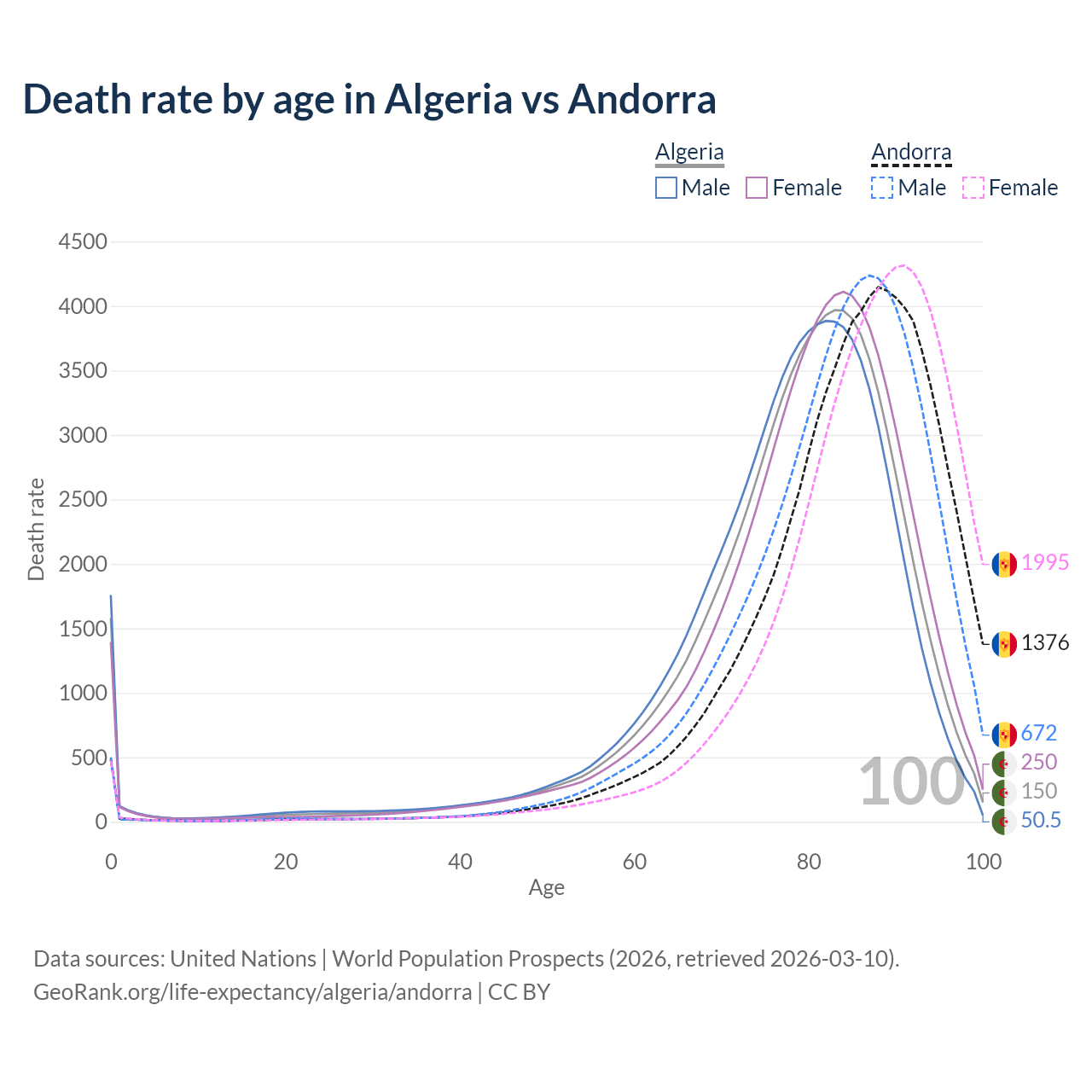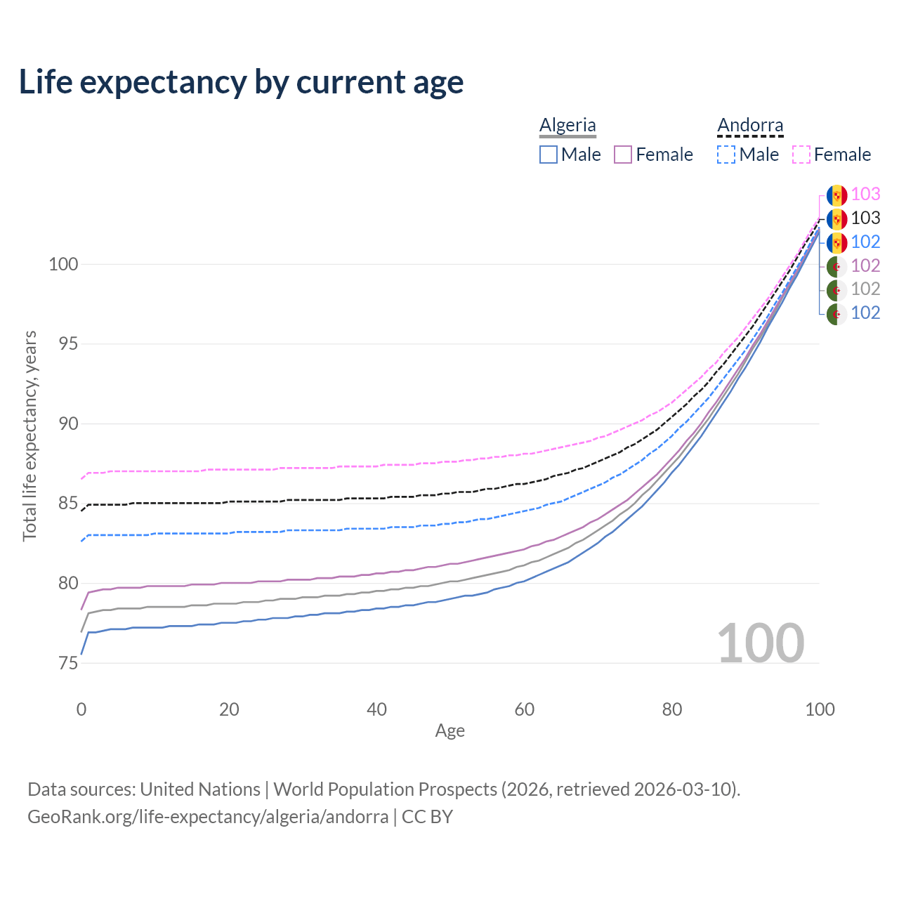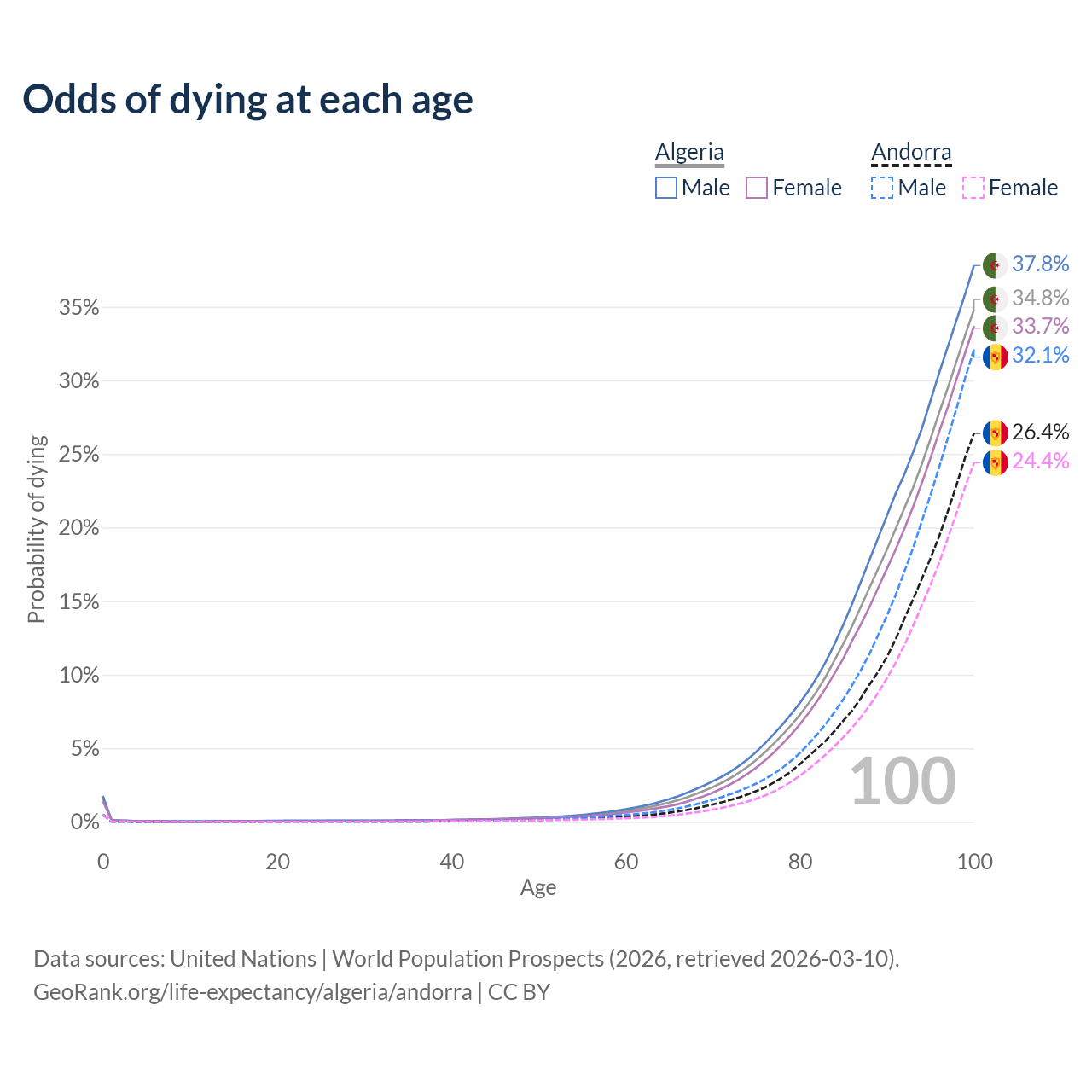 This life expectancy calculator shows the odds of living to 100, 95, 90, and below based on current age for both males and females in Algeria and Andorra, along with mean and median age of death. The calculations are based on the 2026 life tables (actuarial tables) from the UN World Population Prospects.