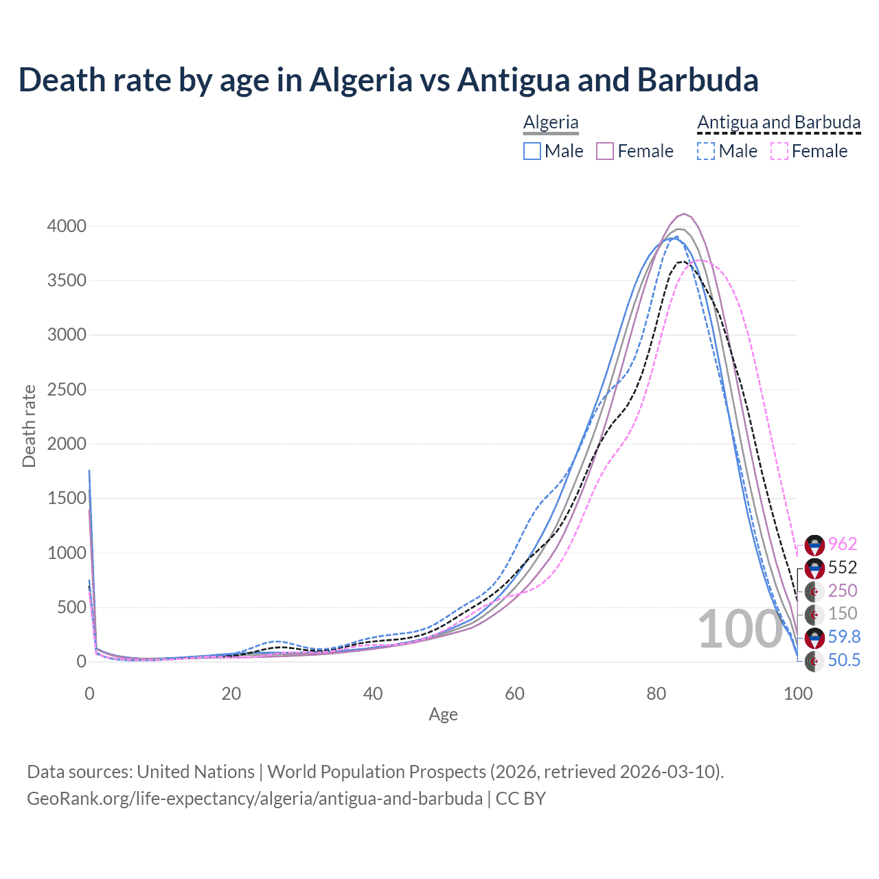 In Algeria, the most common age of death is 83, compared to 84 in Antigua and Barbuda. The median age of death is 80.4 in Algeria and 81.7 in Antigua and Barbuda, meaning only half of each cohort is expected to live past that age.