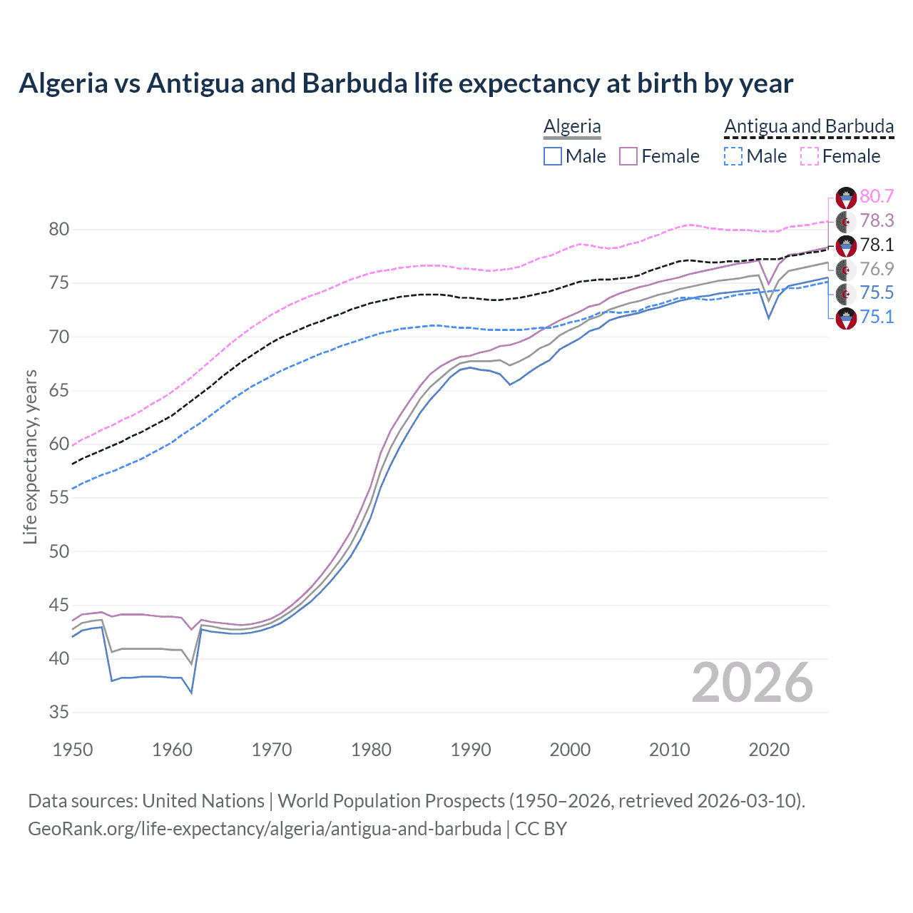 The average life expectancy at birth is 76.9 years in Algeria vs 78.1 in Antigua and Barbuda. Algeria is ranked 76/197 by life expectancy, and Antigua and Barbuda is 63/197. In Algeria, the life expectancy is 75.5 years for males and 78.3 years for females. In Antigua and Barbuda, it's 75.1 years for males and 80.7 years for females.