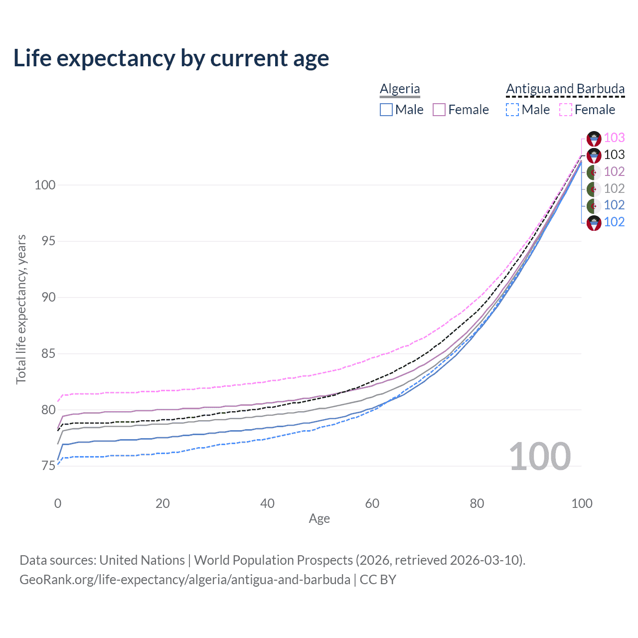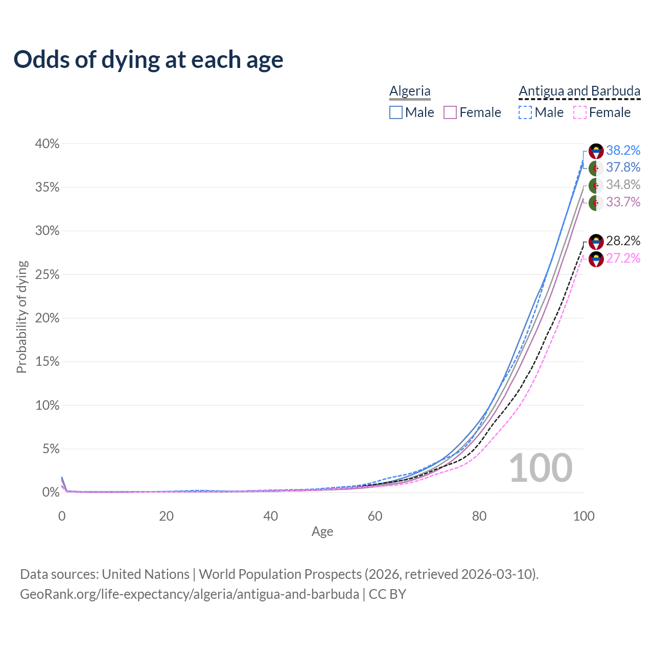 This life expectancy calculator shows the odds of living to 100, 95, 90, and below based on current age for both males and females in Algeria and Antigua and Barbuda, along with mean and median age of death. The calculations are based on the 2026 life tables (actuarial tables) from the UN World Population Prospects.