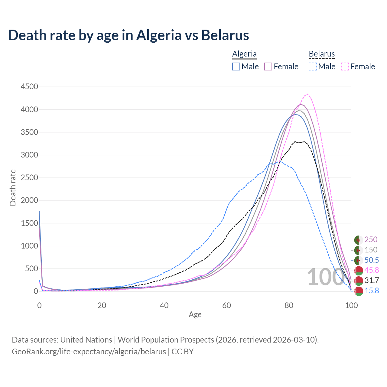 This life expectancy calculator shows the odds of living to 100, 95, 90, and below based on current age for both males and females in Algeria and Belarus, along with mean and median age of death. The calculations are based on the 2026 life tables (actuarial tables) from the UN World Population Prospects.