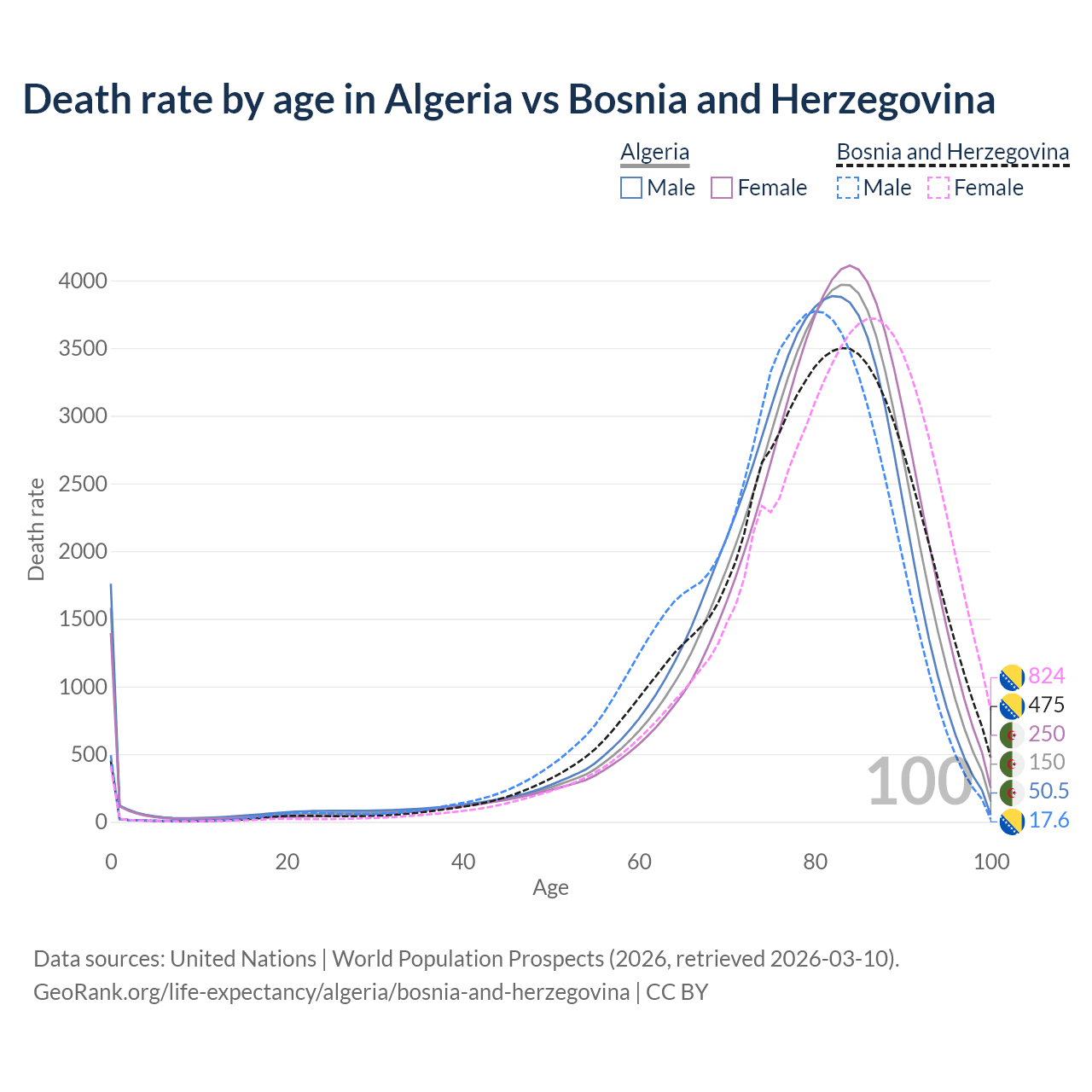 In Algeria, the most common age of death is 83, compared to 83 in Bosnia and Herzegovina. The median age of death is 80.4 in Algeria and 80.7 in Bosnia and Herzegovina, meaning only half of each cohort is expected to live past that age.