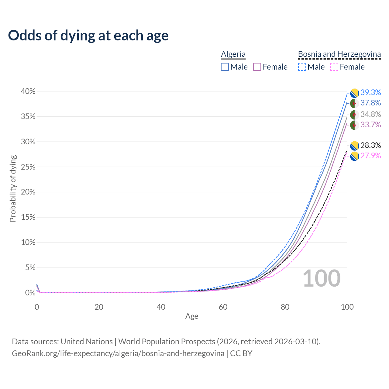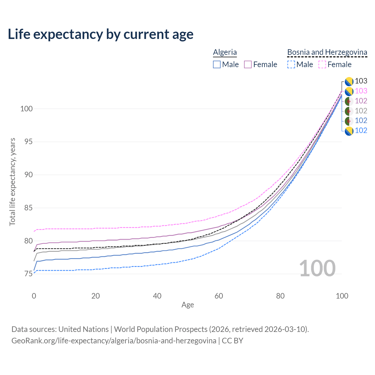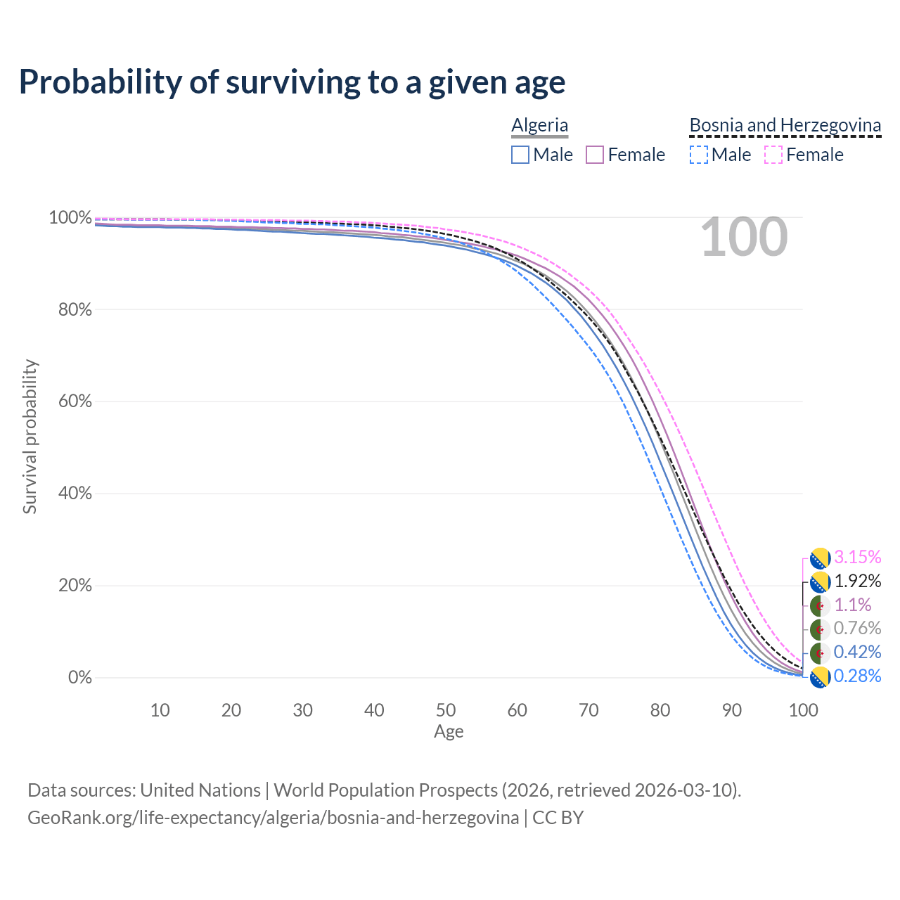 This life expectancy calculator shows the odds of living to 100, 95, 90, and below based on current age for both males and females in Algeria and Bosnia and Herzegovina, along with mean and median age of death. The calculations are based on the 2026 life tables (actuarial tables) from the UN World Population Prospects.