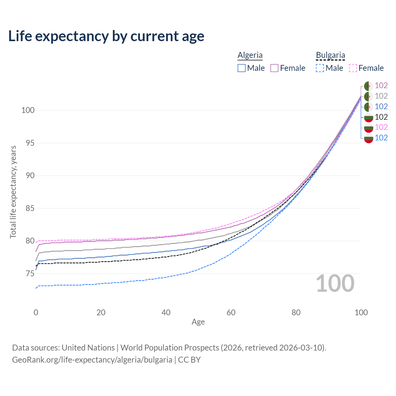 This life expectancy calculator shows the odds of living to 100, 95, 90, and below based on current age for both males and females in Algeria and Bulgaria, along with mean and median age of death. The calculations are based on the 2026 life tables (actuarial tables) from the UN World Population Prospects.