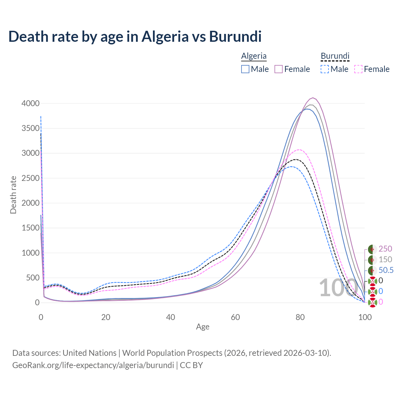 In Algeria, the most common age of death is 83, compared to 0 in Burundi. The median age of death is 80.4 in Algeria and 71.6 in Burundi, meaning only half of each cohort is expected to live past that age.