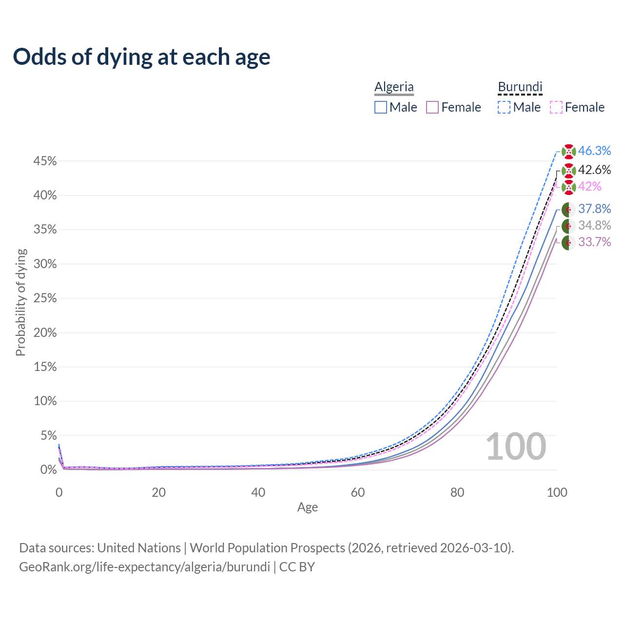 This life expectancy calculator shows the odds of living to 100, 95, 90, and below based on current age for both males and females in Algeria and Burundi, along with mean and median age of death. The calculations are based on the 2026 life tables (actuarial tables) from the UN World Population Prospects.