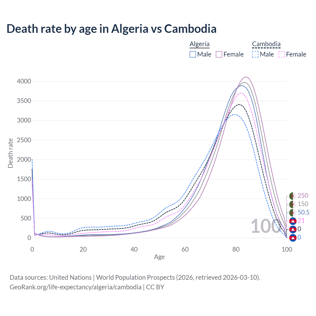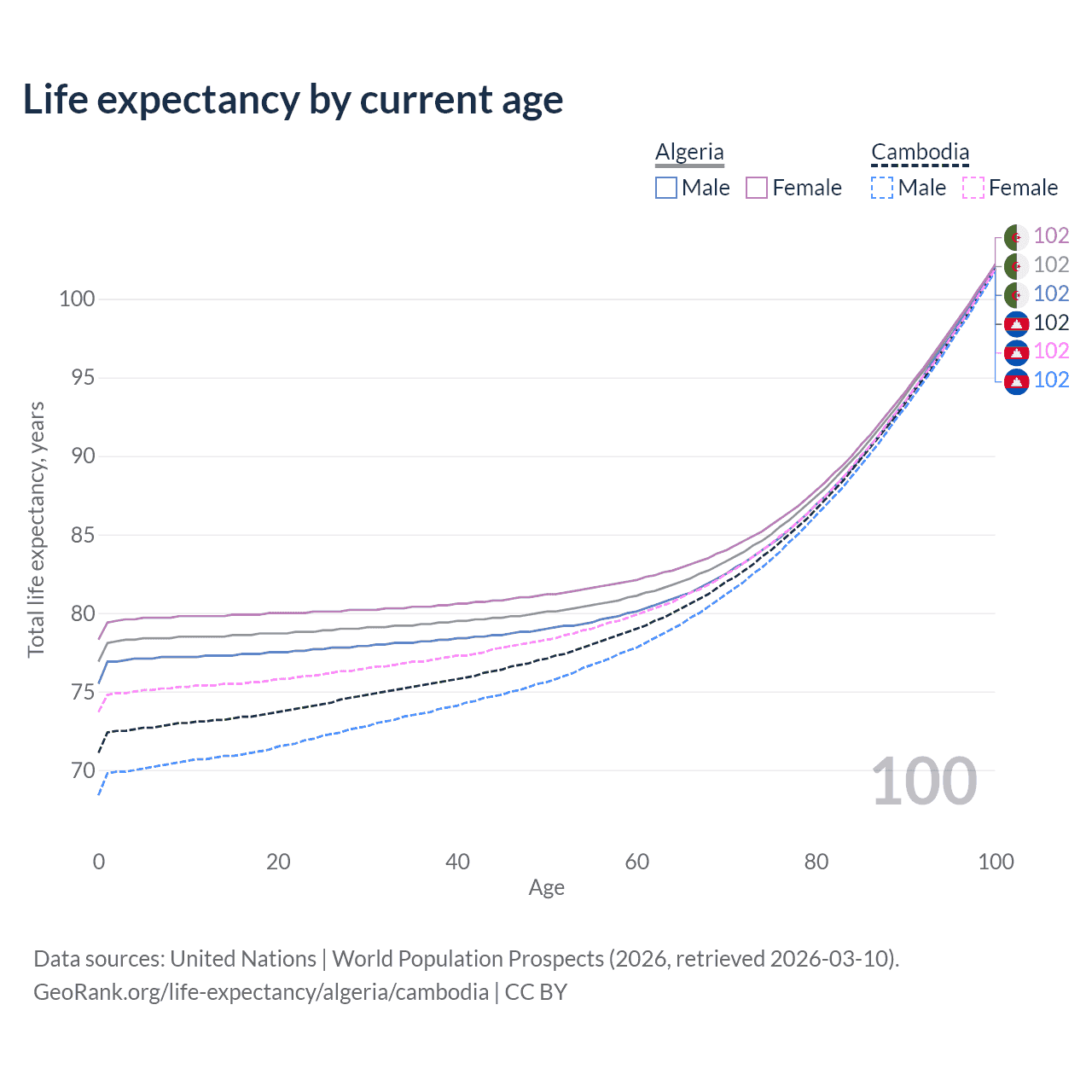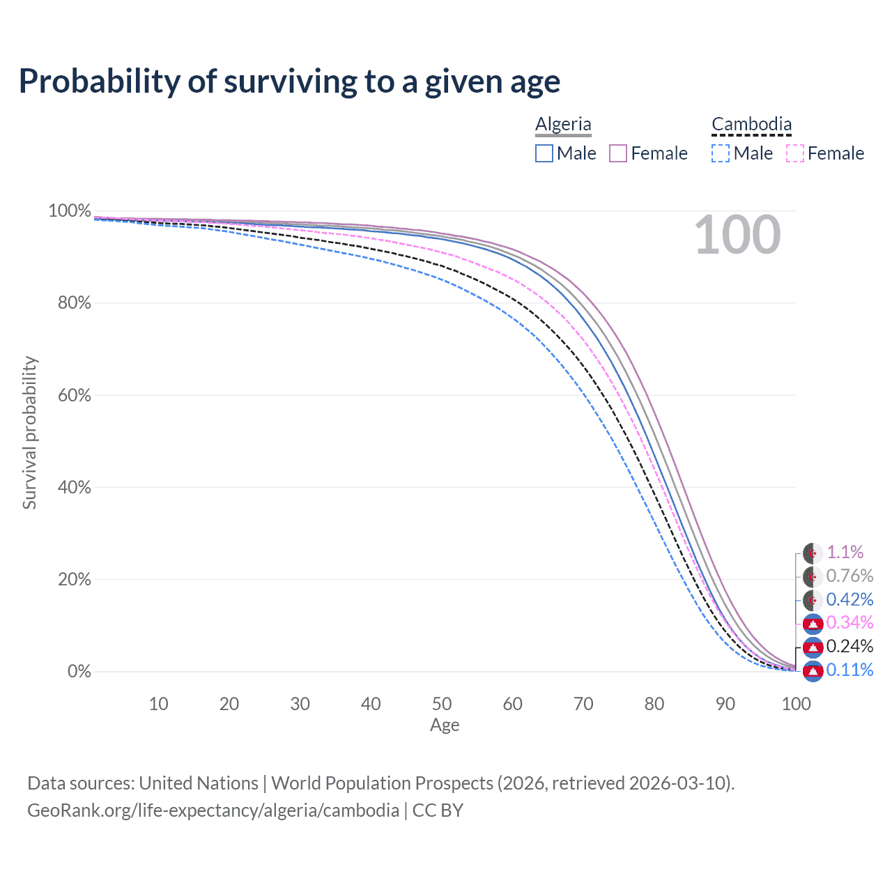 This life expectancy calculator shows the odds of living to 100, 95, 90, and below based on current age for both males and females in Algeria and Cambodia, along with mean and median age of death. The calculations are based on the 2026 life tables (actuarial tables) from the UN World Population Prospects.