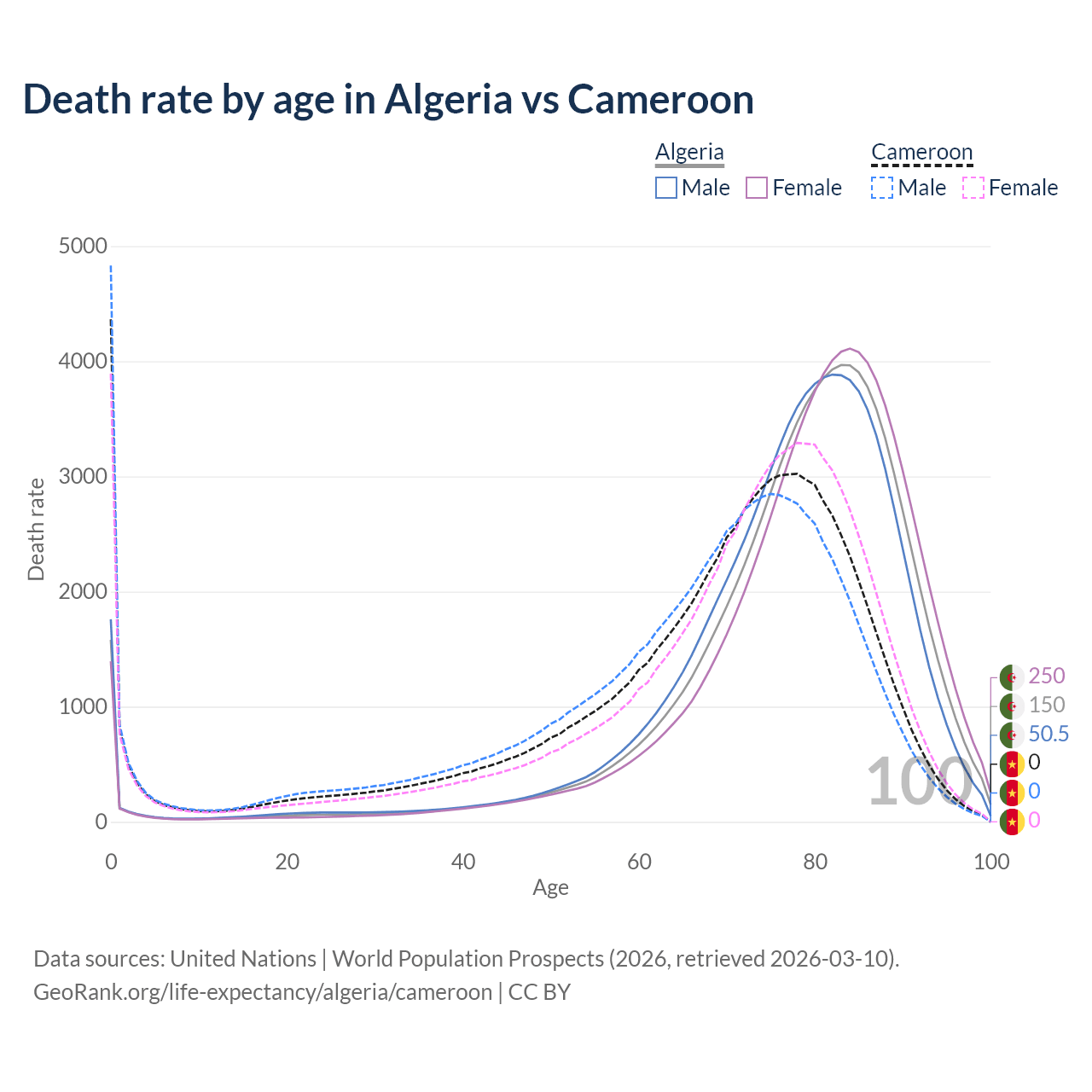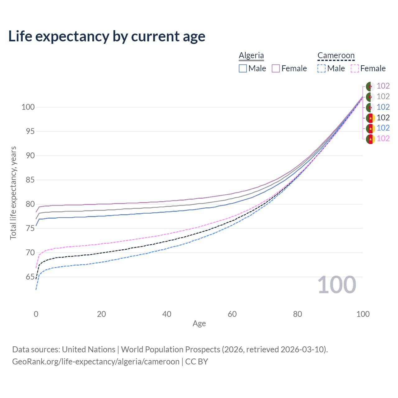 This life expectancy calculator shows the odds of living to 100, 95, 90, and below based on current age for both males and females in Algeria and Cameroon, along with mean and median age of death. The calculations are based on the 2026 life tables (actuarial tables) from the UN World Population Prospects.