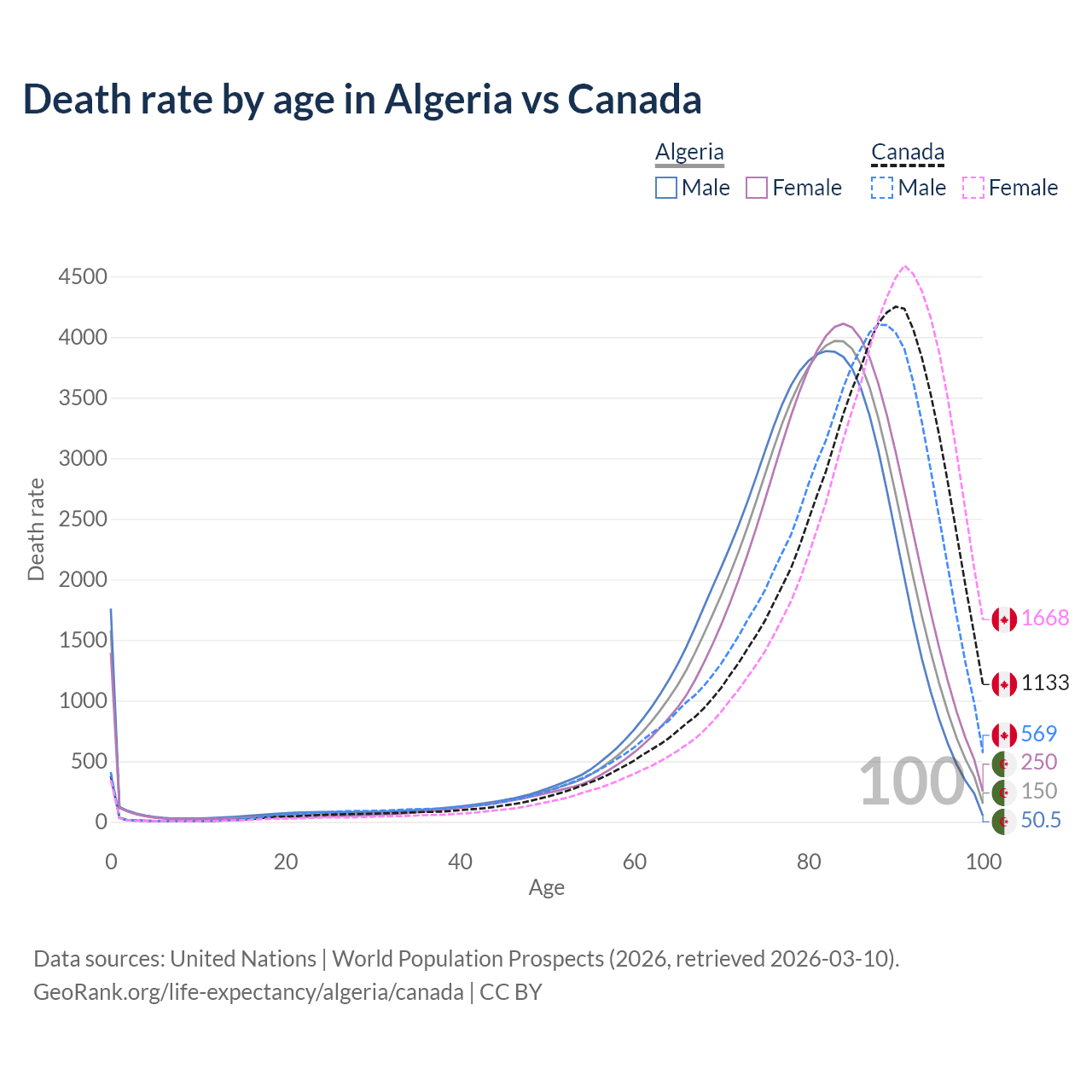 In Algeria, the most common age of death is 83, compared to 90 in Canada. The median age of death is 80.4 in Algeria and 86.4 in Canada, meaning only half of each cohort is expected to live past that age.