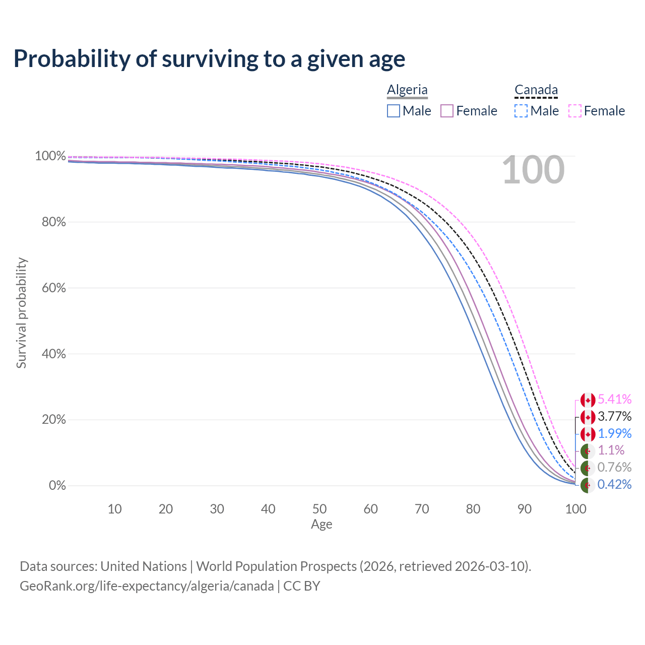 This life expectancy calculator shows the odds of living to 100, 95, 90, and below based on current age for both males and females in Algeria and Canada, along with mean and median age of death. The calculations are based on the 2026 life tables (actuarial tables) from the UN World Population Prospects.